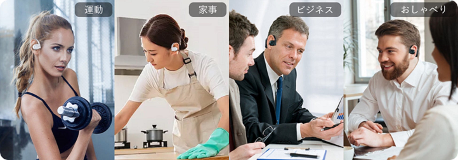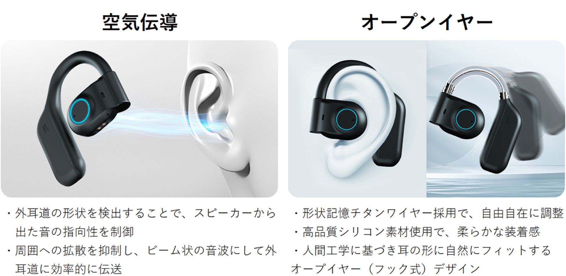 【快適性と安全性】空気伝導技術とオープンイヤーデザインを採用し、耳掛けフック部分には形状記憶合金ワイヤと高品質シリコン素材を使用しています。外耳道を圧迫しないので、長時間使用しても耳の疲れを感じにくいだけでなく、外耳炎や音響性聴覚障害といった耳のトラブルリスクが軽減されるなど快適な装着感を実現します。耳掛けフックは自由自在に調整できるので耳にしっかりフィットし、激しい運動をしても外れにくい設計になっています。日常生活のさまざまなシチュエーションで音楽などを快適に『ながら聴き』したい人にとって、耳を塞がず周囲の状況を把握できるので、安全かつ安心して使用できます。
