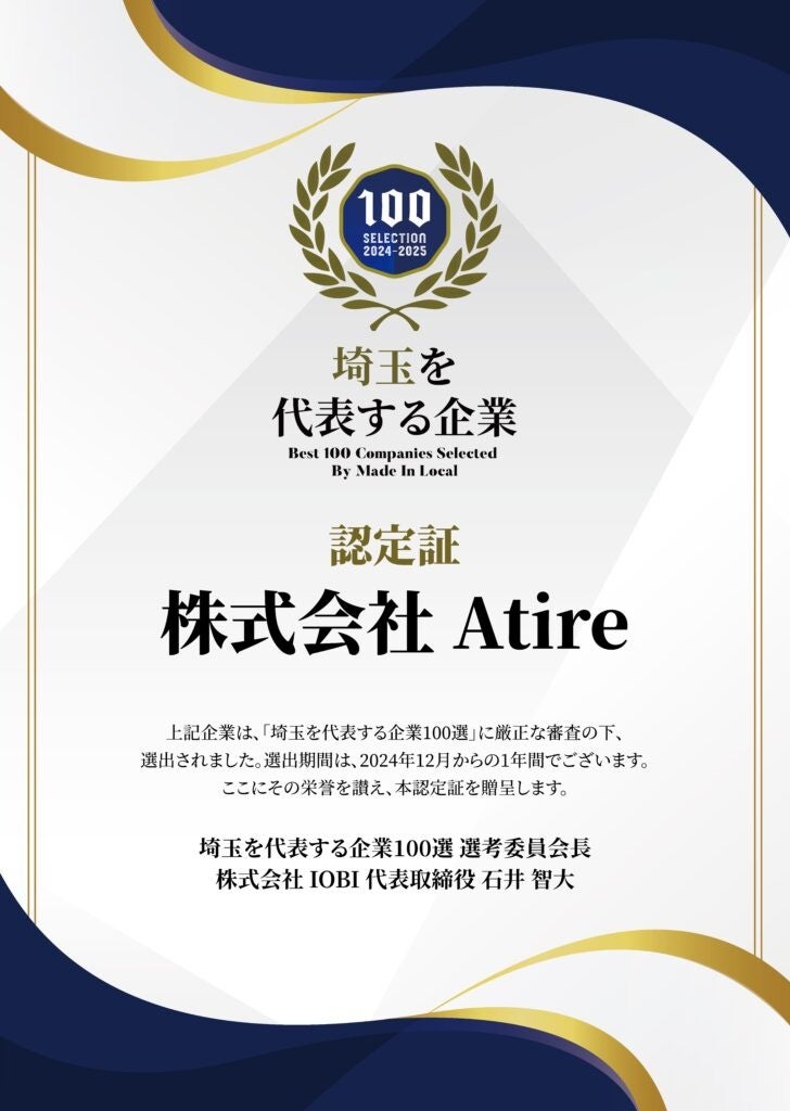 株式会社Atire(本社:埼玉県志木市、代表取締役:伊藤渚)は、地方創生メディア「Made In Local」が選定する「地域を代表する企業100選」にて、埼玉エリアの企業100選の認定を受けました。「地域を代表する企業100選」は、その地域で雇用創出をしているか、地域住民に愛されているかなど厳正に審査し各地域エリアで100社だけが選ばれるブランド認証です。