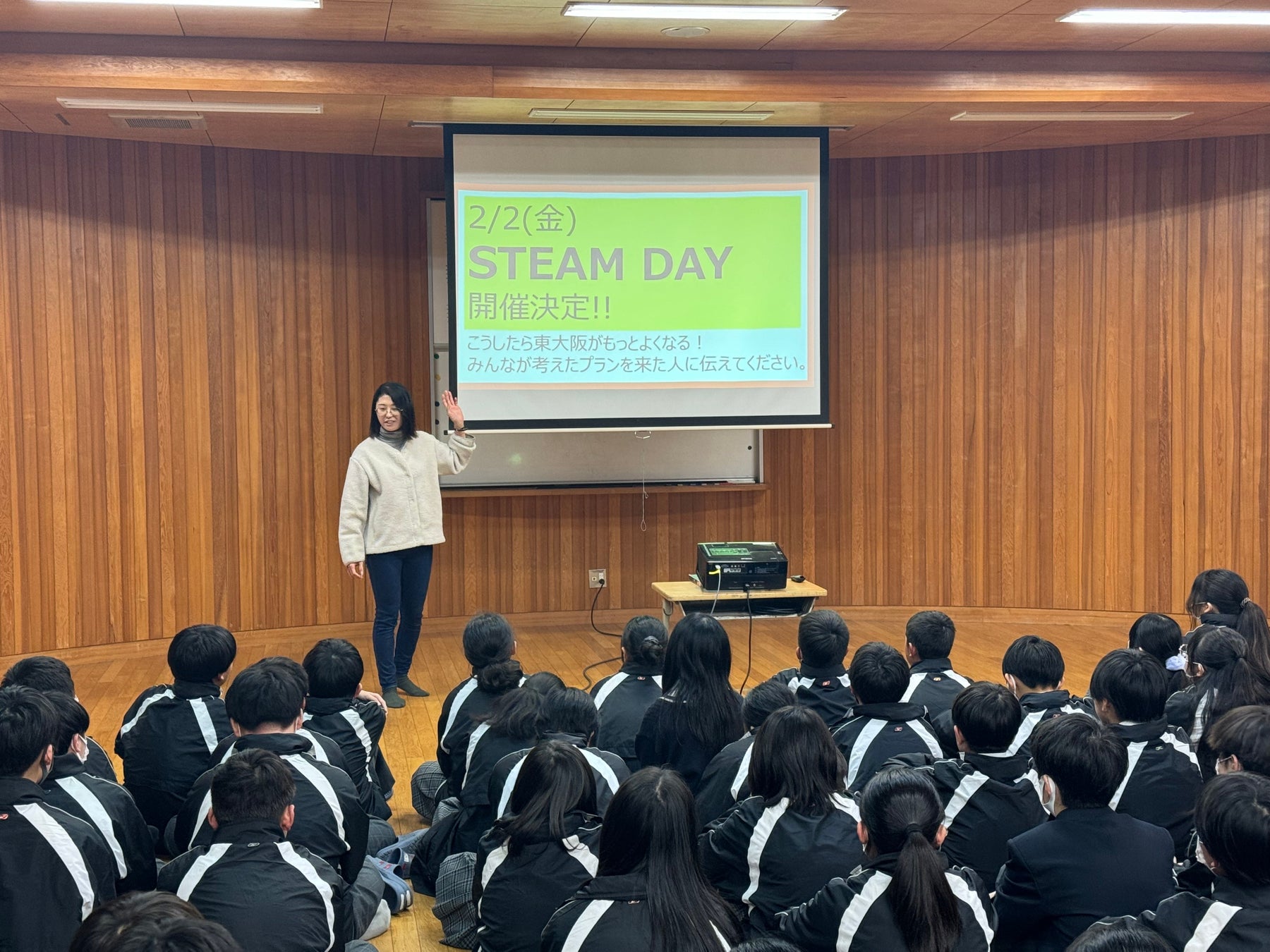 steAmは、令和5年度より、くすは縄手南校にて『ものづくりの街:東大阪をより良くするための「もの・ことづくり」』をテーマに、8年生が実社会、実生活の課題に対し、自ら問いを立て、教科の枠を超え、多様な専門知を融合し、新たな価値を生むSTEAM探究学習を進めてまいりました。