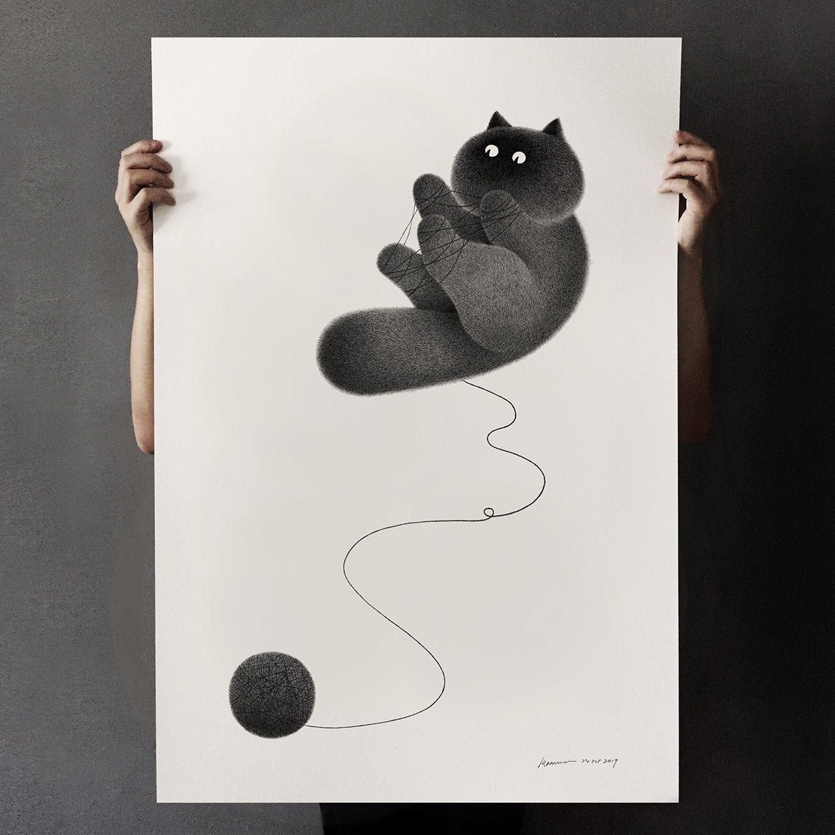 カムウェイ・フォンは、黒のミクロ顔料のみを使った繊細で緻密な線描で、猫を中心とした生き物を描いた線描画作品で知られるアーティストです。モノトーンで描き出される動物たちは、静謐な佇まいを見せながらも豊かな感情や意思を宿しており、他者にとらわれずのびのびと生きる彼らの姿は、私たち人間にも自由でいることを思い出させてくれます。世界中の愛猫家をはじめ、多くのファンを持つ彼の作品には、表層的な可愛らしさと動物たちへの深い敬意が共存しています。