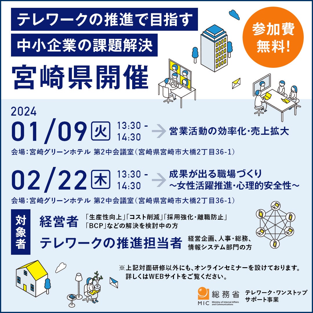 総務省 テレワーク・ワンストップ・サポート事業 地域窓口事務局(受託者:有限責任監査法人トーマツ)は、宮崎県で全2回にわたりテレワークの推進のためのセミナーを開催いたします。