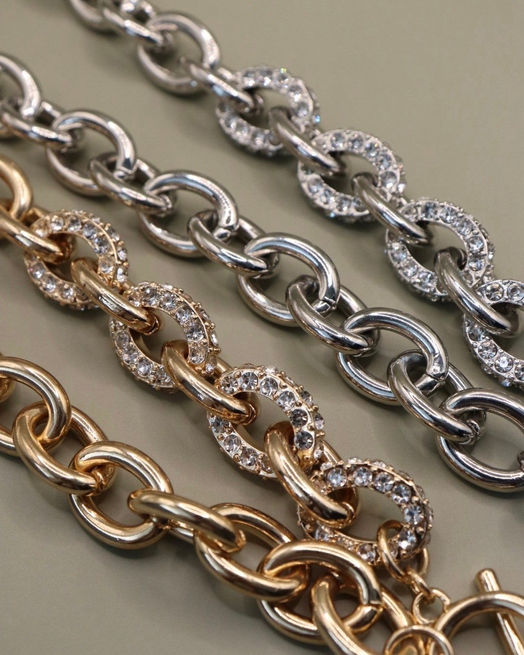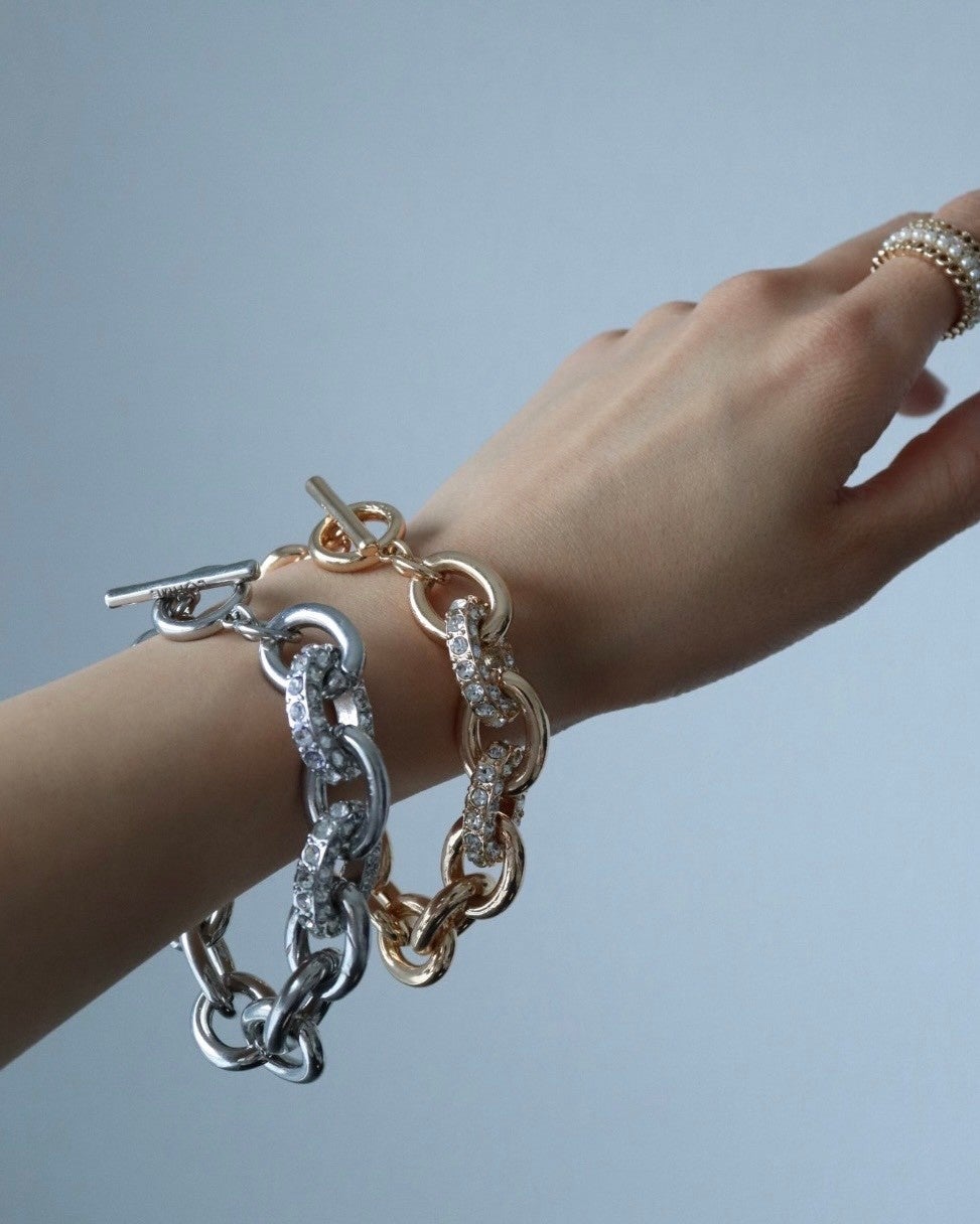チェーンに散りばめられた、さりげないビジューがコーディネートのアクセントに。手元を動かす度きらりと輝き目を惹きつけます。