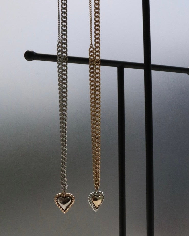 存在感を発揮するハート×チェーンのコンビネーション。左右のアシンメトリーデザインが、スタイリングにひとクセ加えます。単品使いはもちろん、他のネックレスとの重ね付けにも。