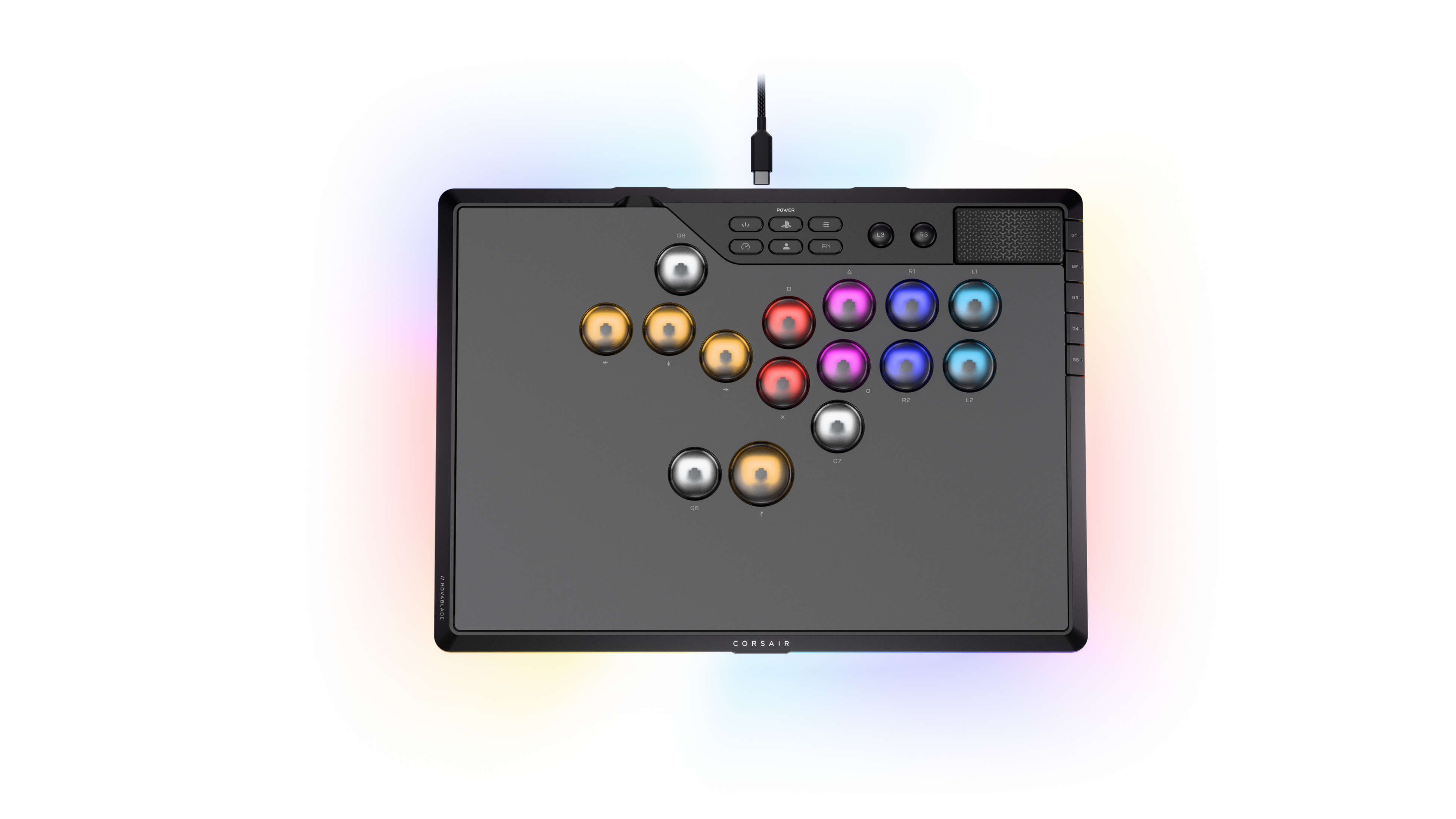 CORSAIR初となるレバーレスコントローラー「NOVABLADE PRO ワイヤレス」は、格闘ゲームの競技シーンにおいて実際に勝利を収めたプロプレイヤーの意見やフィードバックを基に開発されたアーケードコントローラーです。CORSAIRのゲーミングキーボードで培った独自のキースイッチやテクノロジーを盛り込んだ「NOVABLADE PRO ワイヤレス」は、家庭でのコンソールゲームだけでなくプロレベルの試合でもパフォーマンスを発揮します。
