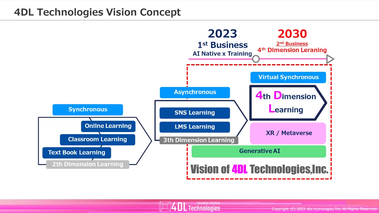 4DLは、学びの新時代をリードするEdTechベンチャーとして、メタバースとAI技術を活用した「四次元学習(4DL=4th Dimension Learning)」の社名になっている4DL概念を推進しています。