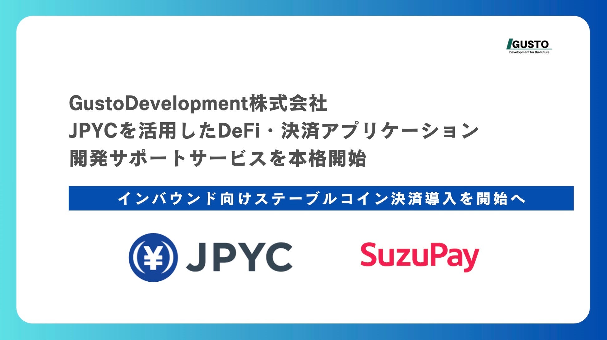 AIやブロックチェーンなどの先進技術を用いたシステム開発を行うGustoDevelopment株式会社(本社:栃木県栃木市、代表取締役:藍 光祐、以下 GustoDevelopment)は、日本円連動ステーブルコイン「JPYC」を活用したDeFi(分散型金融)アプリケーションおよび決済アプリケーションの開発サポートサービスを開始したことをお知らせいたします。
