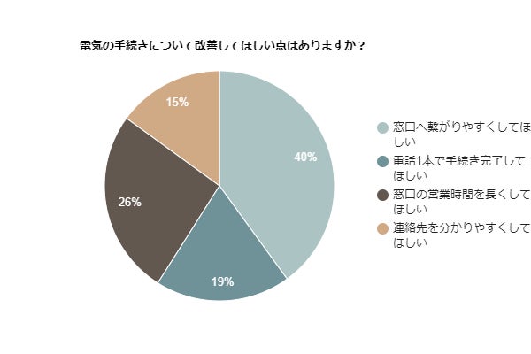 「電気の手続きについて改善してほしい点はありますか?」という質問に対して、「窓口へ繋がりやすくしてほしい」という意見が40%と一番多い意見となりました。