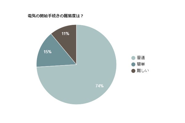 電気の開始手続きの難易度について調査したところ、74%が「普通」、15%が「簡単」と回答しました。
