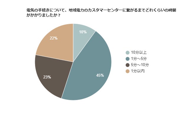 地域電力のカスタマーセンターへ電話が繋がるまでにかかった時間を調査したところ、「1分以内」が22%、「1分~5分」が45%と約7割の方型が比較的短い時間で電話が繋がっています。