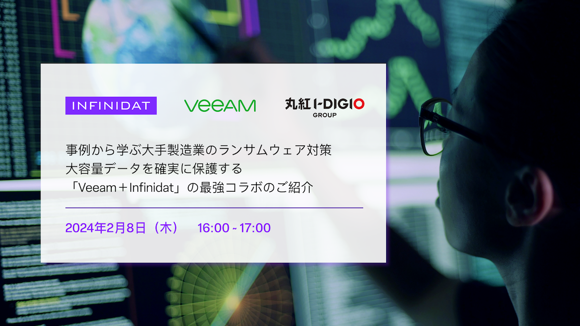 Infinidat Japan合同会社は、丸紅情報システムズ株式会社ならびにヴィーム・ソフトウェア株式会社と共同で、「事例から学ぶ大手製造業のランサムウェア対策:大容量データを確実に保護する『Veeam+Infinidat』の最強コラボのご紹介」と題したWebinarを2月8日(木)に開催します。