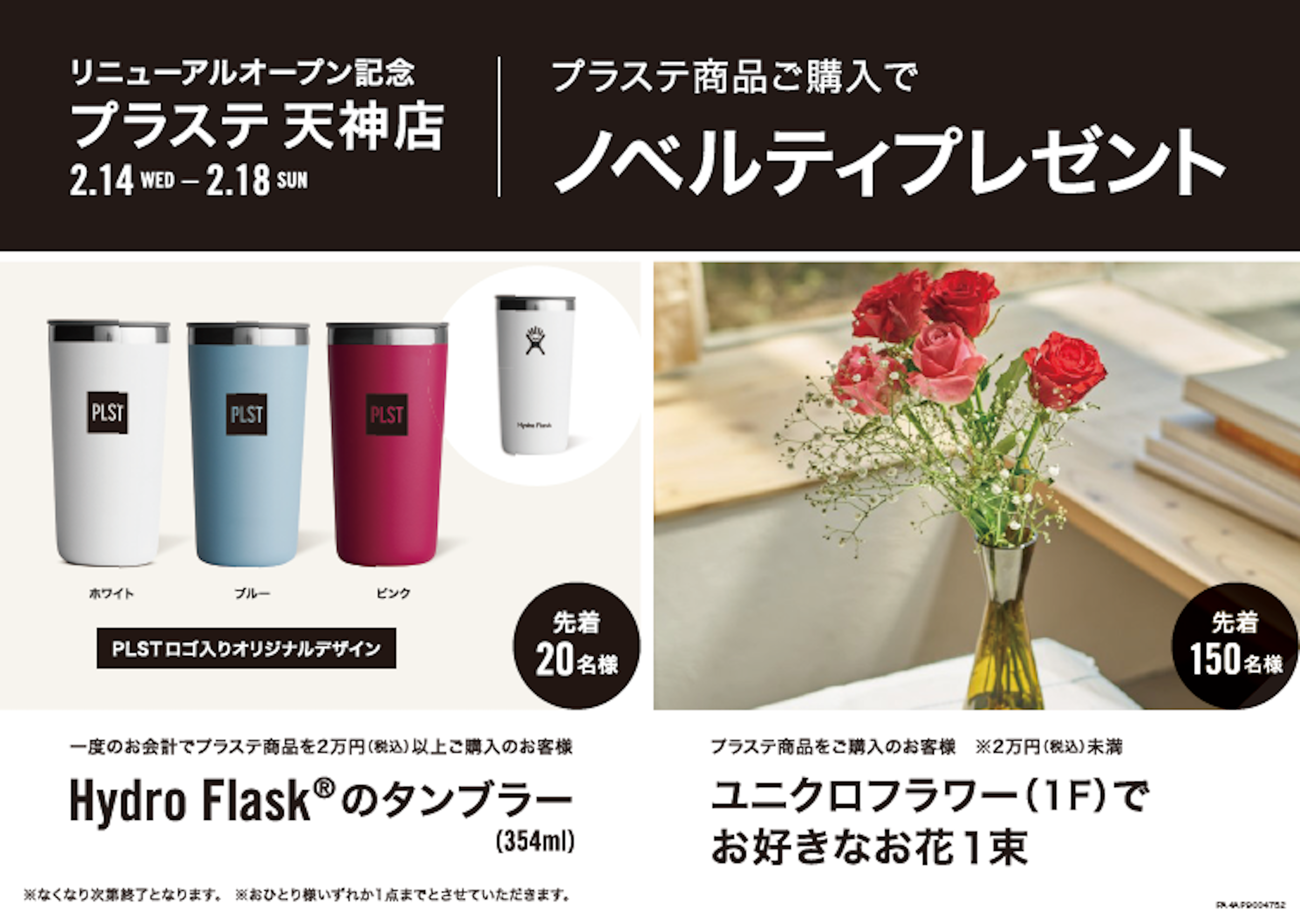 2月14日(水)~2月18日(日)の期間、一度のお会計で2万円(税込)以上ご購入のお客様にはHydro Flask®のタンブラー(354ml)を先着20名様にプレゼントいたします。また、2万円(税込)未満ご購入のお客様にはユニクロフラワーでお好きなお花1束をプレゼントいたします。