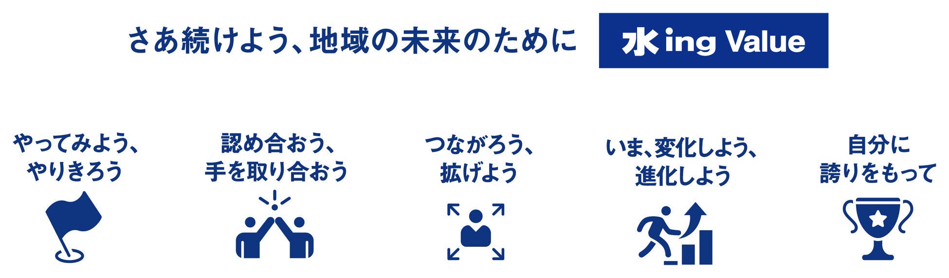 当社グループは、2023年に「水ingバリュー」を設定しました。水ingバリューとは、当社グループの共通の価値観であり、その内容において、互いを尊重し協力し合いながら自律した社員が個々の能力を発揮し、共に変革に取り組む姿勢を表しています。