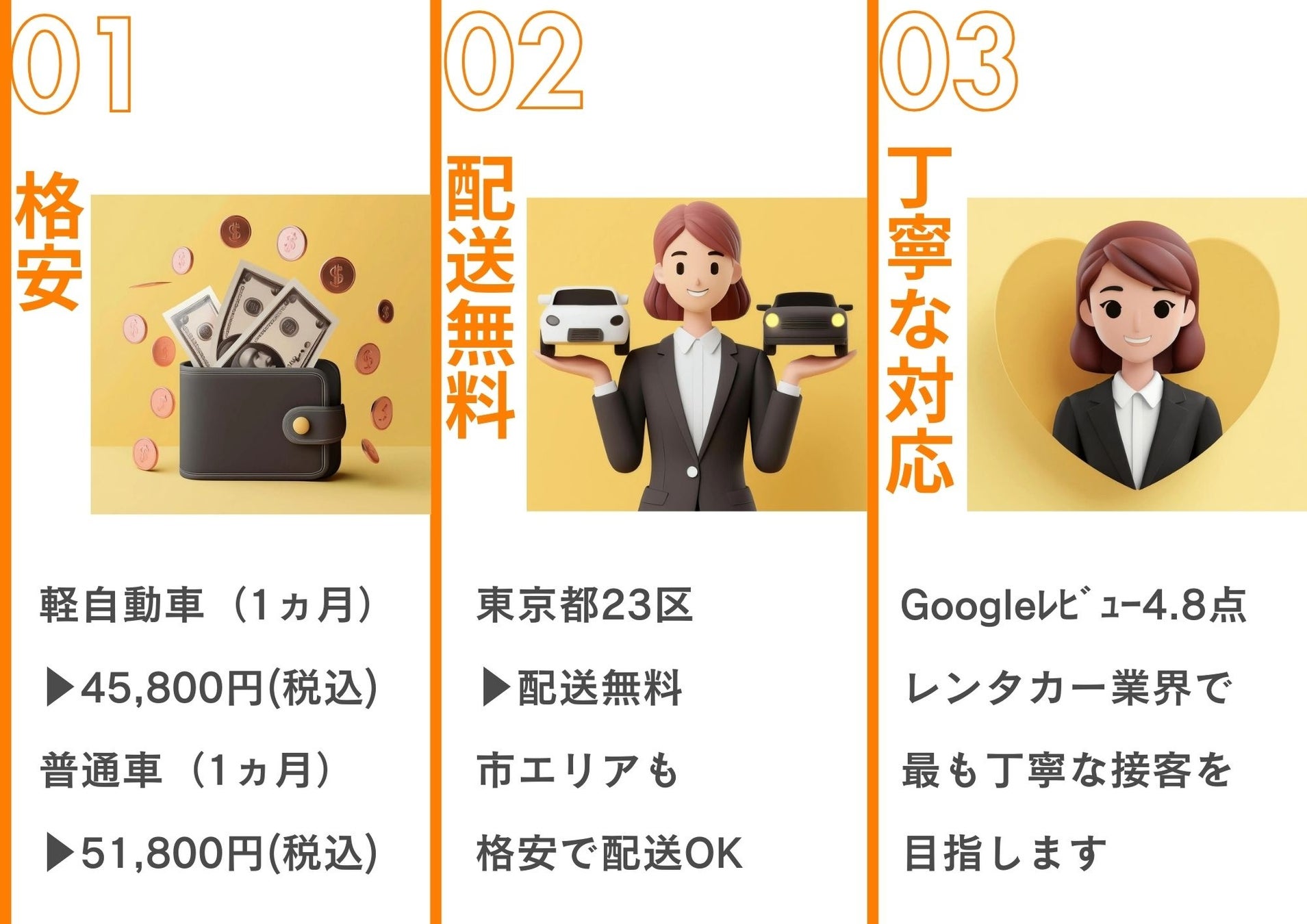 サービスは東京を中心に関東全県、大阪、福岡まで展開しており、出張や旅行、新車の納車待ちなど、さまざまな用途でご利用いただける体制を整えています。また、リーズナブルな価格設定に加え、丁寧な対応がお客様から高評価をいただいております。