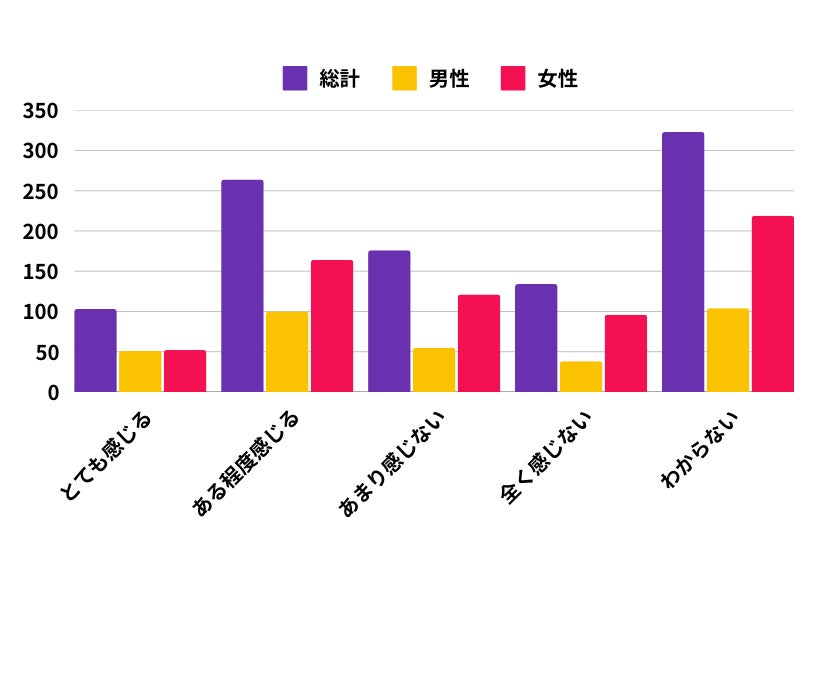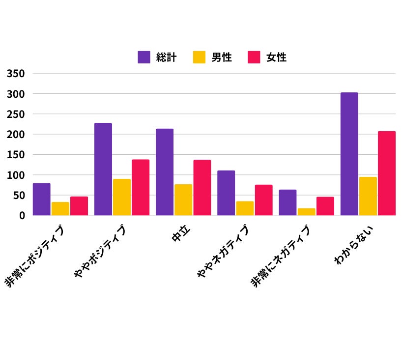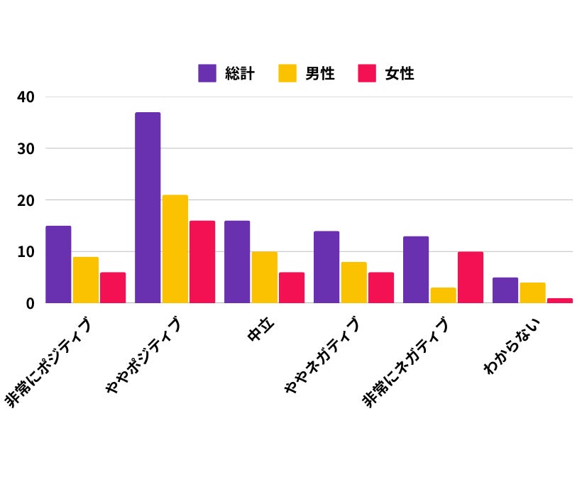 男性は女性より肯定的な評価で、男性は「非常にポジティブ」が約9.5%、「ややポジティブ」が約25.9%で計約35.4%、女性は約7.2%と約21.2%で計約28.4%という結果でした。女性では「ややネガティブ」が約11.7%、「非常にネガティブ」が約7.1%、男性ではそれぞれ約10.1%と約5.2%でした。「中立」は男女とも約22%、「わからない」は女性の約31.9%、男性の約27.3%で女性が高めです。男性が前向きなのに対し、女性が中立的・否定的な傾向を示しています。