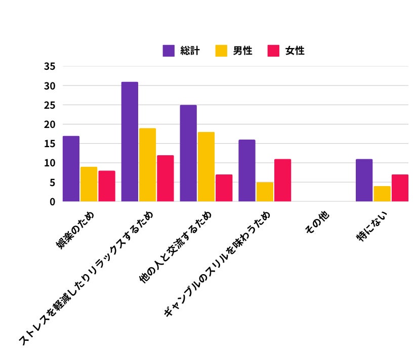 ストレス軽減を重視する割合は男性(約35%)の方が女性(約27%)よりも高く、他人との交流を選ぶ割合も男性の約33%に対し女性は約16%と、やはり男性の方が高めです。ギャンブルのスリルを選んだ人は女性の約24%に対し男性が約9%と、女性が上回っています。娯楽を選んだ人は男性の約16%、女性の約18%で同等、「特にない」は男性の約7%、女性の約16%でした。男性はストレス緩和と他者との交流、女性はスリルを求める傾向があり、動機に男女差が見られます。