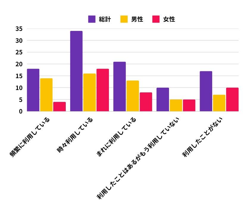男性は女性よりもソーシャル機能を利用する傾向が強く、たとえばオンラインカジノのおすすめなどの情報交換やコミュニケーションツールとして頻繁に利用している回答者の割合は、男性の約25%に対し女性は10%未満にとどまっています。対照的に、女性は時々利用する割合が約40%と高く、男性は約29%でした。さらに、男性はまれに利用する割合が約24%であるのに対し、女性は約18%と低めです。また、ソーシャル機能を一度も利用したことがないと答えた割合は、女性が約22%に対し男性は約13%、「利用したことはあるがもう利用していない」という回答は、男性が約9%に対し女性が約11%でほぼ同等です。男性がソーシャル機能をより積極的かつ一貫して利用している一方で、女性は時々利用するか、全く利用しない傾向が男性より強く、男女間で明確な違いが現れています。