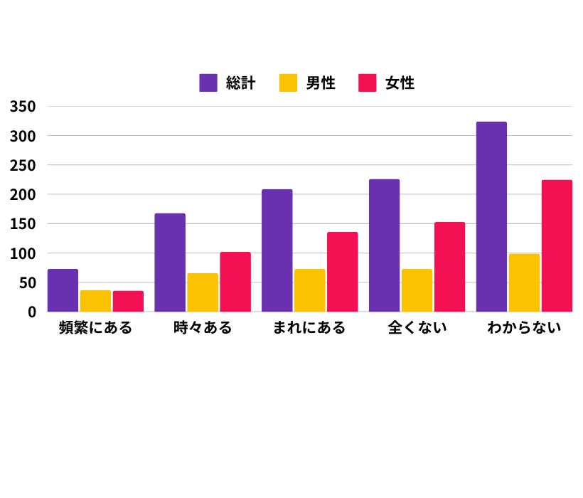 男性は女性より、ゲームの話を共有することでストレス軽減を試みる傾向が強いようです。男性の約10.6%が頻繁に話すのに対し女性では約5.5%で、時々話すのは男性の約19%に対し女性は約15.6%と差が見られます。まれに話すのは男性約21%に対し女性が約20.9%とほぼ同率で、全く話さないのは男性約21%に対し女性は約23.5%で、女性がやや多めでした。「わからない」は女性約34.5%、男性約28.4%で、男性の方がより効果を認識し、積極的に話す傾向がうかがえます。
