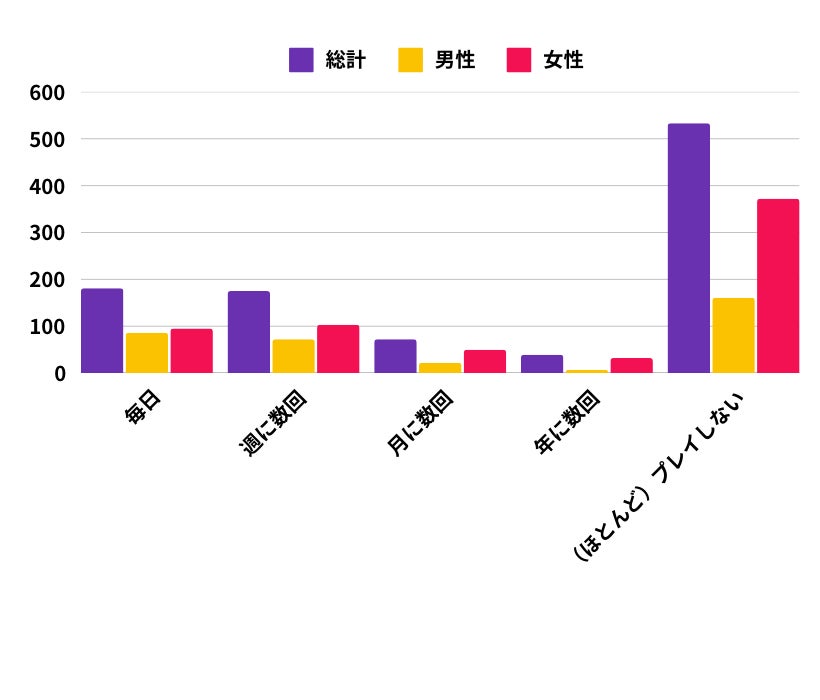 男性は女性の約1.7倍の割合で毎日ゲームをプレイしており、男性の方が頻繁にゲームをしている実体が浮き彫りになっています。