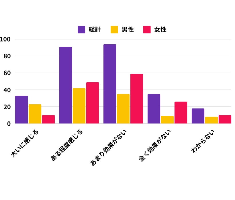 男性は女性よりギャンブル系ゲームの効果を肯定的に評価しており、男性の約56%、女性の約38%が効果を感じています。効果がないと答えるのは男性の約38%に対し女性は約55%で、女性には懐疑的な傾向が見られます。ここでは、ゲームの効果に対する男女間の認識の違いが明確に現れています。
