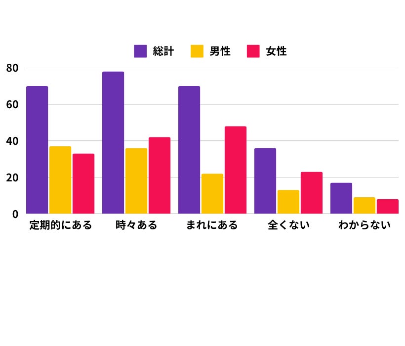 男性は女性より定期的にオンラインカジノゲームをプレイする傾向が強く、男性の約31.6%、女性の約21.4%が定期的にプレイしています。時々プレイするのは男性の約30.8%に対し女性は約27.3%と僅差で、「まれにある」は女性の約31.2%に対し男性は約18.8%と女性が上回ります。全くプレイしないのは女性約14.9%に対し男性は約11.1%と、女性の方が未経験者が多いようです。全体的に、男性にはより頻繁に利用する傾向が見られました。