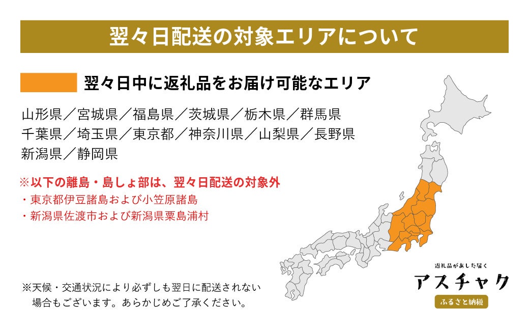 翌日配送が可能な地域は、山形県、宮城県、福島県、茨城県、栃木県、群馬県、埼玉県、千葉県、東京都、神奈川県、山梨県、長野県、新潟県、静岡県の1都13県で、お礼の品をいち早くお届けいたします。