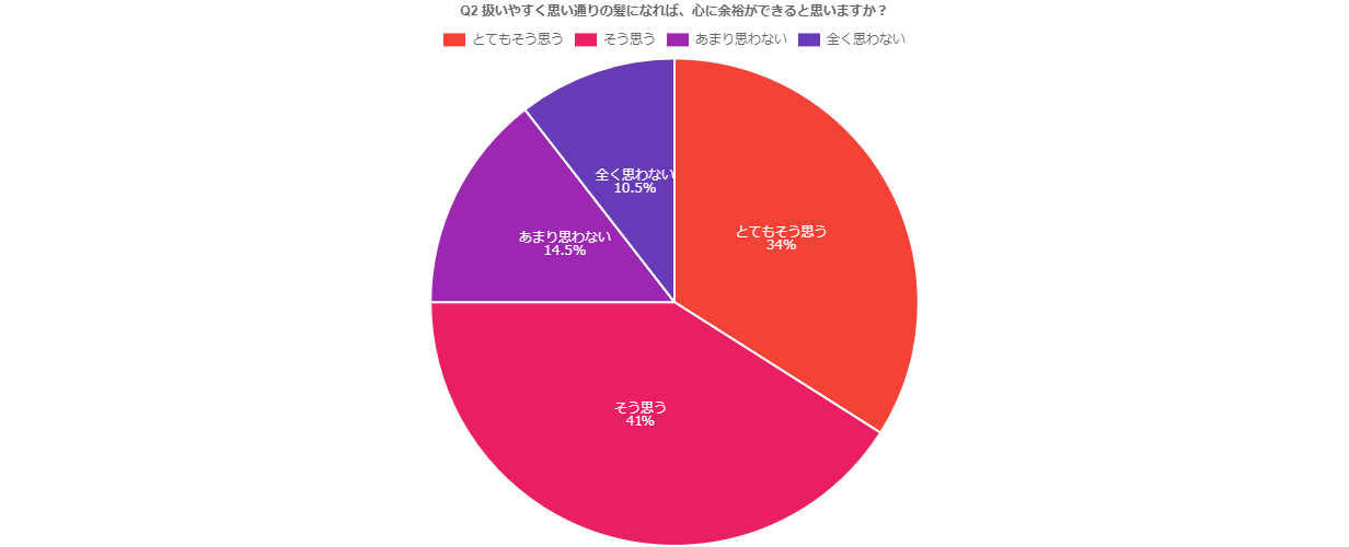 実際に、LAUGHBASEが女性200名を対象に実施したアンケートによると、”扱いやすく思い通りの髪になれば、心に余裕ができると思いますか?”という質問に対し、”とてもそう思う”と”そう思う”の回答をあわせると約75%という結果になりました。