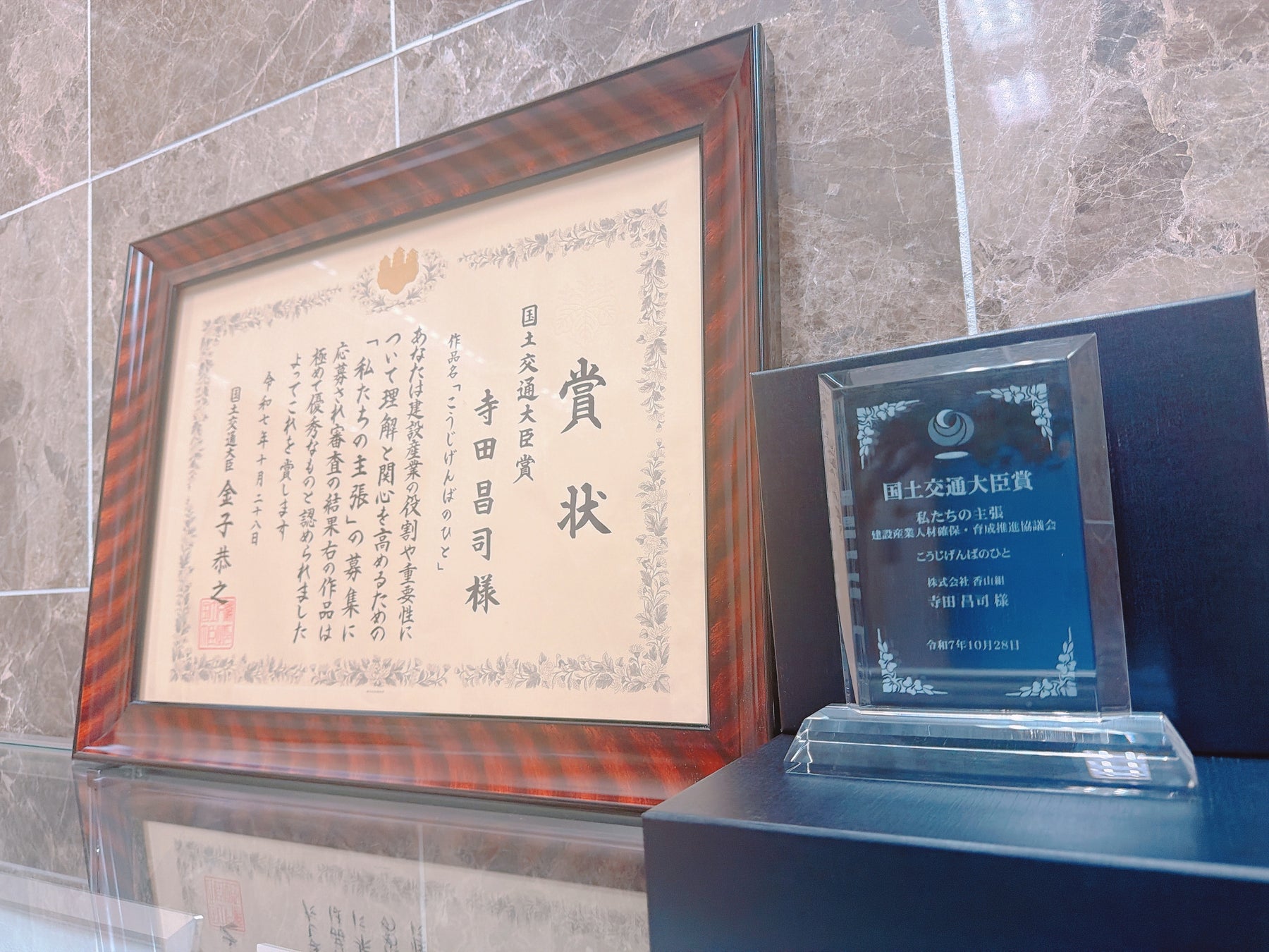 国土交通省および建設産業人材確保・育成推進協議会(事務局:(一財)建設業振興基金)が主催する、建設産業の役割や重要性への理解と関心を高めることを目的とした「建設産業に関する作文コンクール」において、株式会社香山組(本社:兵庫県尼崎市、代表取締役社長:香山 昌哉)の社員・寺田 昌司が、コンクール創設以来18年、近畿地方整備局管内の企業として初となる国土交通大臣賞を受賞いたしました。
