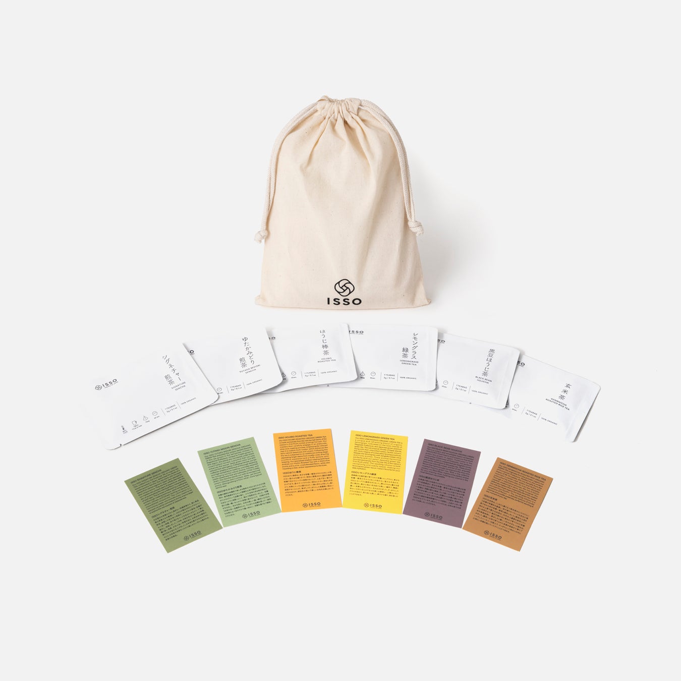 ISSO TEAの代表的なフレーバー6種をティーバッグ個包装にして、彩り豊かなフレーバーカードとともに、環境に配慮したオリジナルのコットン巾着にお入れしたISSOアソートメントセット。