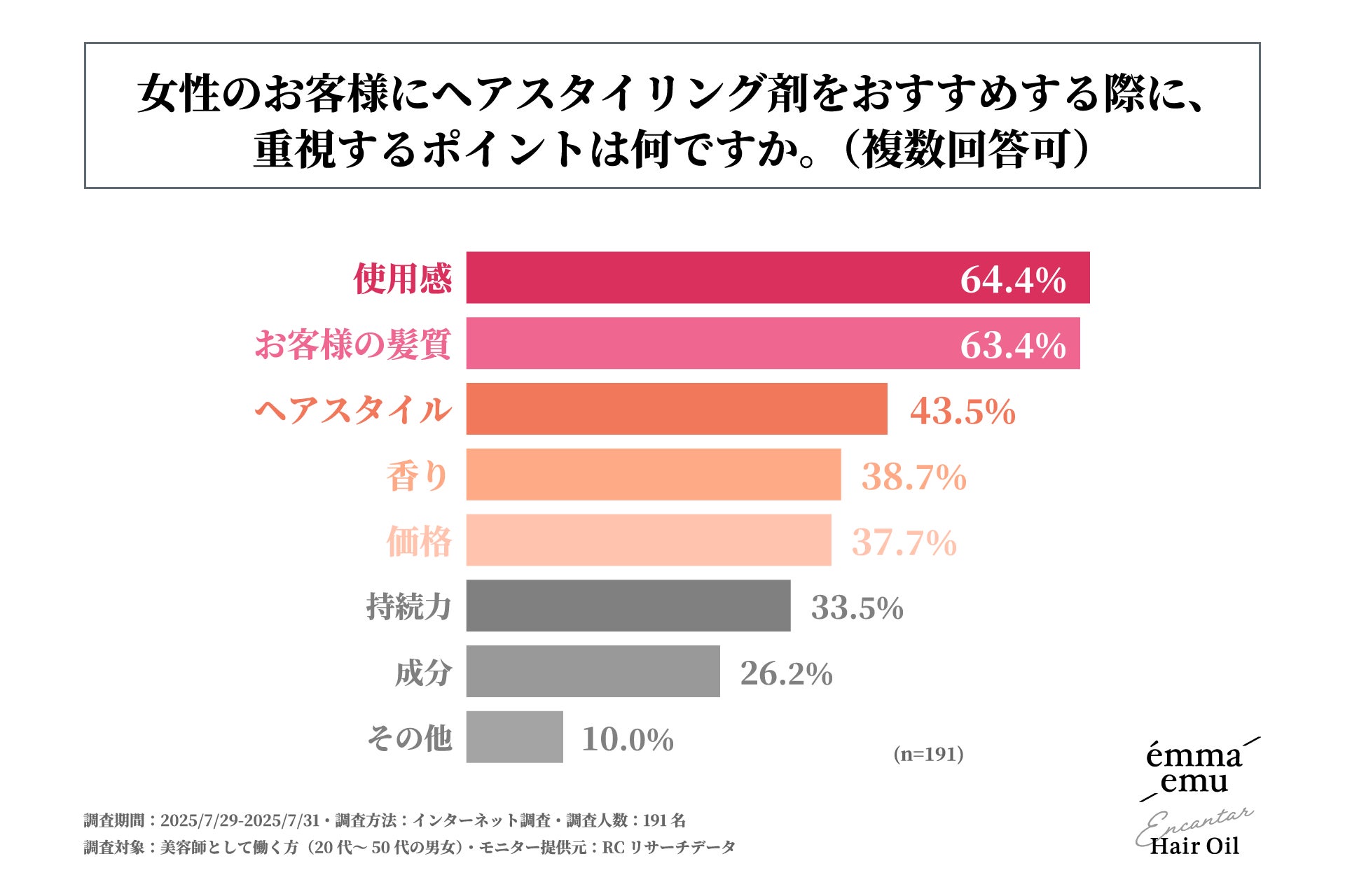 美容師が女性客にヘアスタイリング剤をおすすめする際に、主に重視するポイントは、「使用感」や「お客様の髪質」