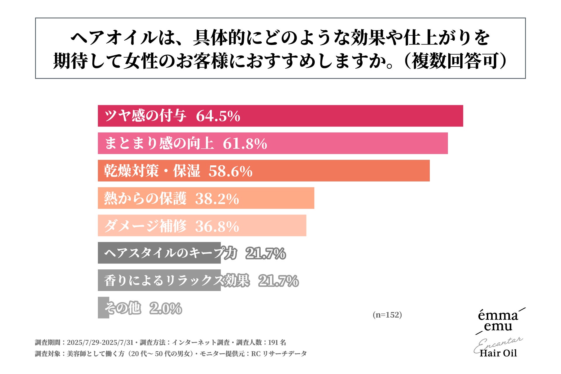 調査の最後、ヘアオイルをおすすめすることがある(たまにある、ある、よくある)と回答した人を対象に「ヘアオイルは、具体的にどのような効果や仕上がりを期待して女性客におすすめするか」を尋ねる設問への回答では、1位が「ツヤ感の付与」で64.5%、2位が「まとまり感の向上」で61.8%、3位が「乾燥対策・保湿」で58.6%という結果になりました。この結果から、美容師が女性客にヘアオイルをおすすめする際、ヘアオイルに最も期待する効果や仕上がりは「ツヤ感の付与」であることが明らかになりました。