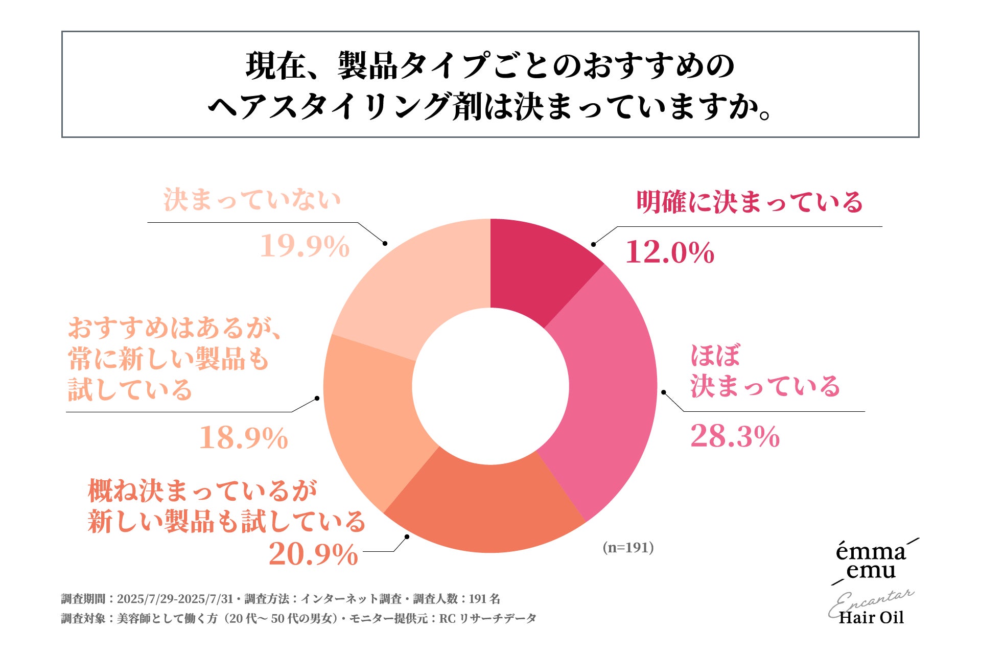 続いて、「現在、製品タイプごとのおすすめのヘアスタイリング剤は決まっているか」を尋ねる設問への回答では、1位が「ほぼ決まっている」で28.3%、2位が「概ね決まっているが新しい製品も試している」で20.9%、3位が「決まっていない」で19.9%という結果になりました。1位と2位の回答、および「明確に決まっている(12.0%)」という回答を合計すると回答率60%を超える形となり、この結果から、美容師の6割以上は、製品タイプごとにおすすめのヘアスタイリング剤が概ね決まっていることが判明しました。