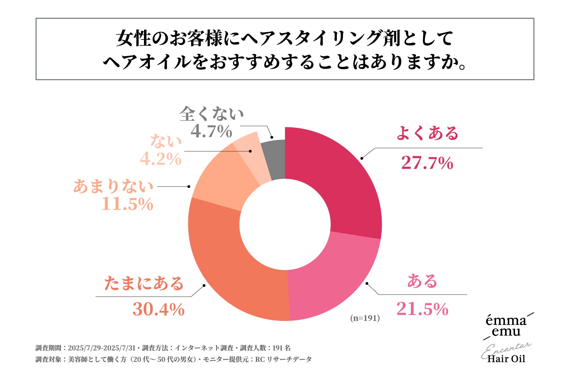 ・美容師の約8割が、女性客にヘアスタイリング剤としてヘアオイルをおすすめすることがある