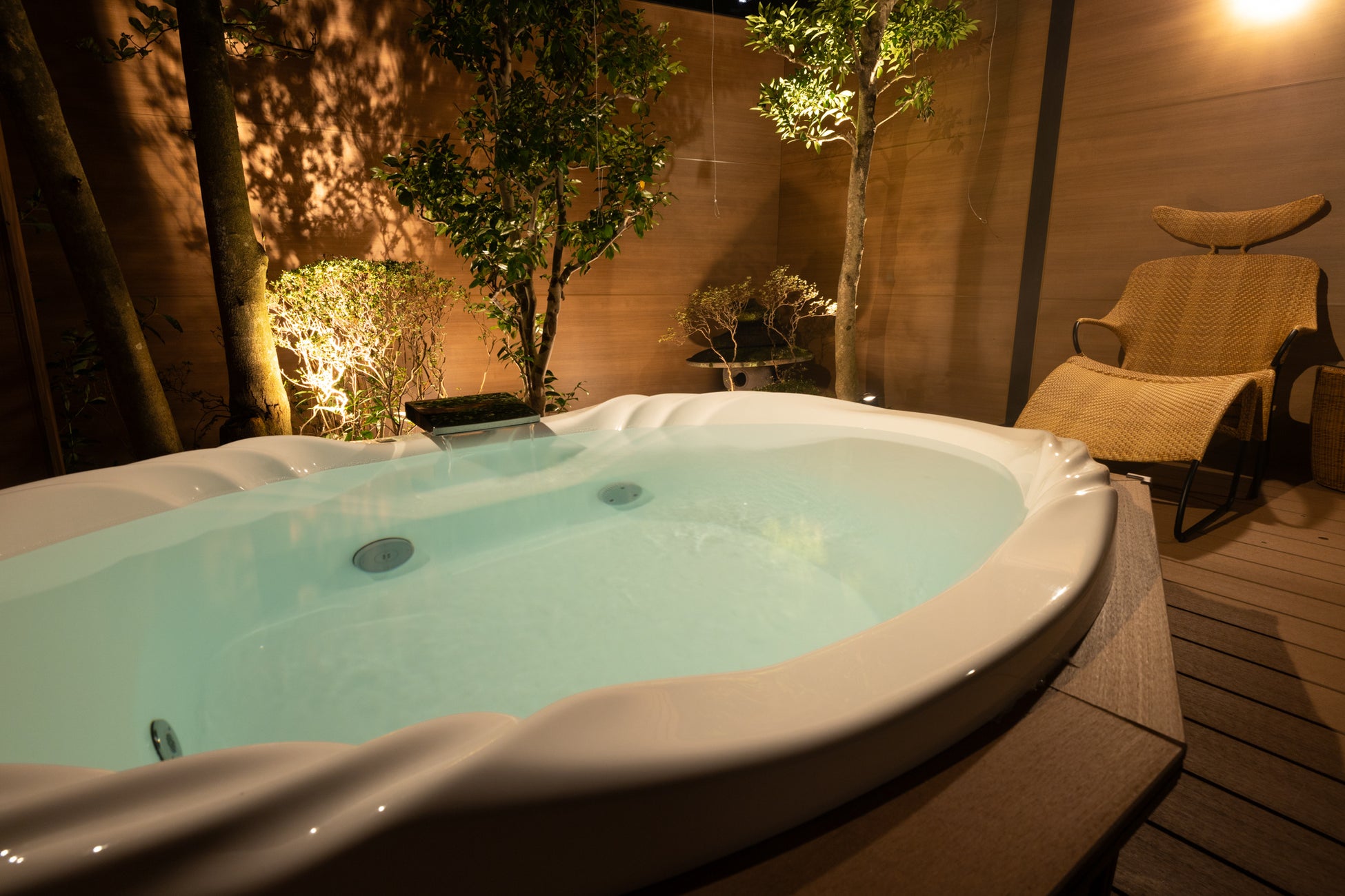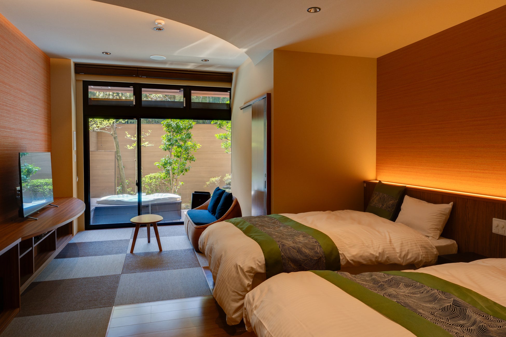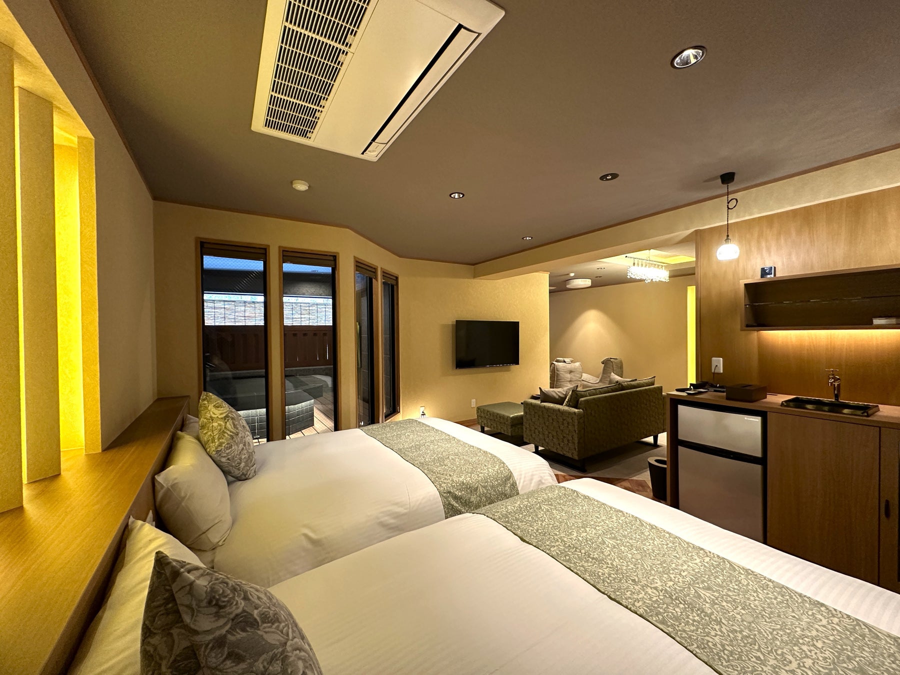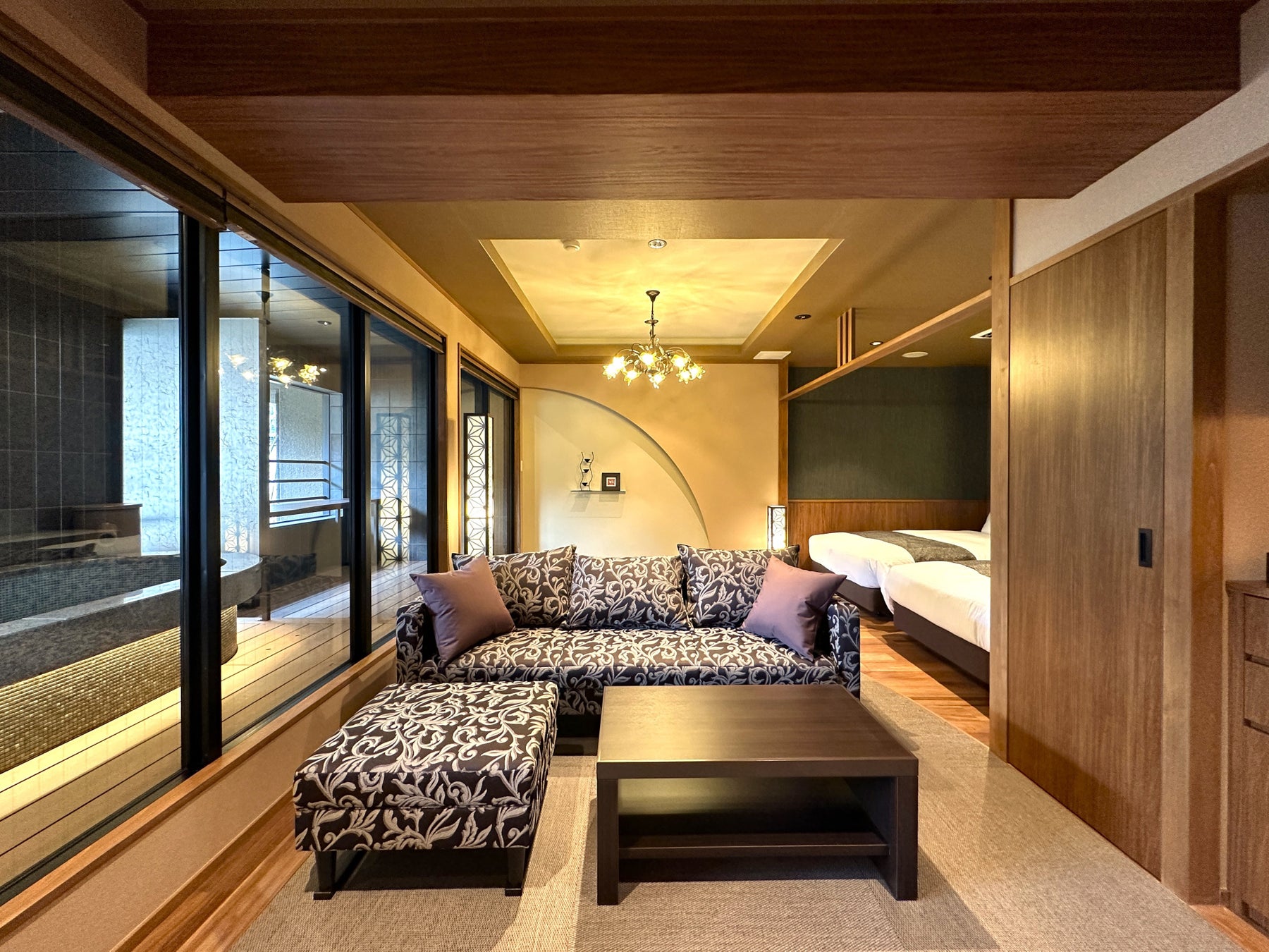 インテリアは伝統的な和風の要素と現代的でスタイリッシュなテイストを融合した和モダン。露天風呂は天然温泉を24時間楽しめ、ご高齢者のニーズに応え全てシモンズベットルーム。パウダールームにはReFa製品を設置。肌にうるおい、透明感をあたえるスキンケアビューティシャワー、サロン帰りのような美しい仕上がり効果のビューテックドライヤープロ、室内にはNESPRESSO製コーヒーメーカーを設置し特別感のあるプライベート空間をご用意させていただきました。