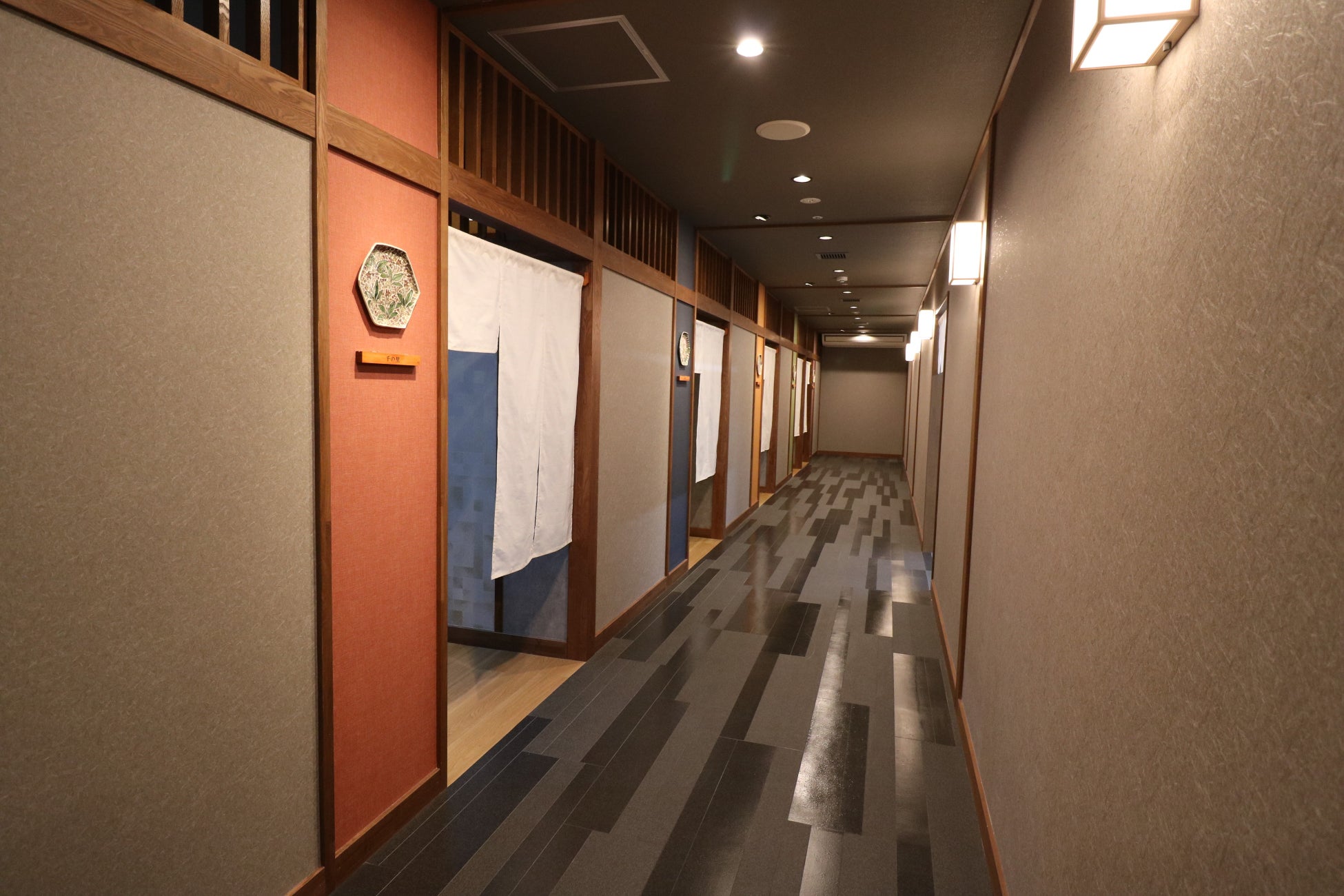 なし「天然温泉」とアットホームなおもてなしが高評価の49室の湯宿。今回お食事処を2ヵ所「AYAME」「SHOUBU」をリニューアルオープン。それぞれ入口には九谷五彩の色が使われていて九谷焼の陶板があしらわれ、お客様をお迎えさせていただいております。