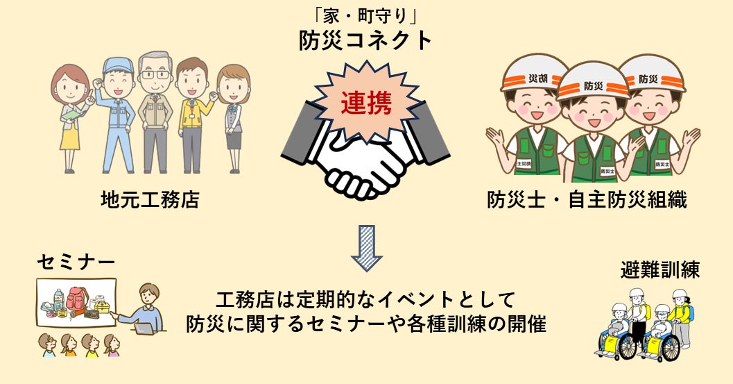 当法人は、全国の地場工務店や賃貸管理会社が主体となって、地域の防災力向上に取り組むというものです。しかし、工務店だけでは専門的な知識やノウハウがないため、当法人に登録する防災士会員、地域の自主防災組織等との連携を図りながら事業を推進してまいります。