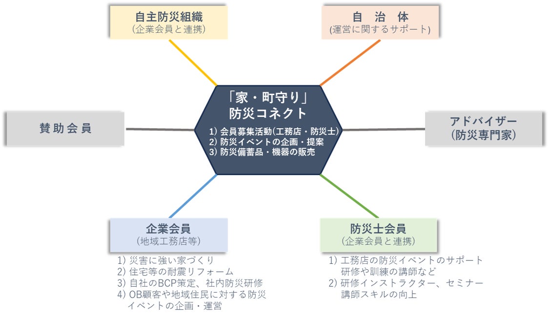特に事業の中核となるのは、地場工務店を中心とした企業会員組織と防災士会員組織となります。