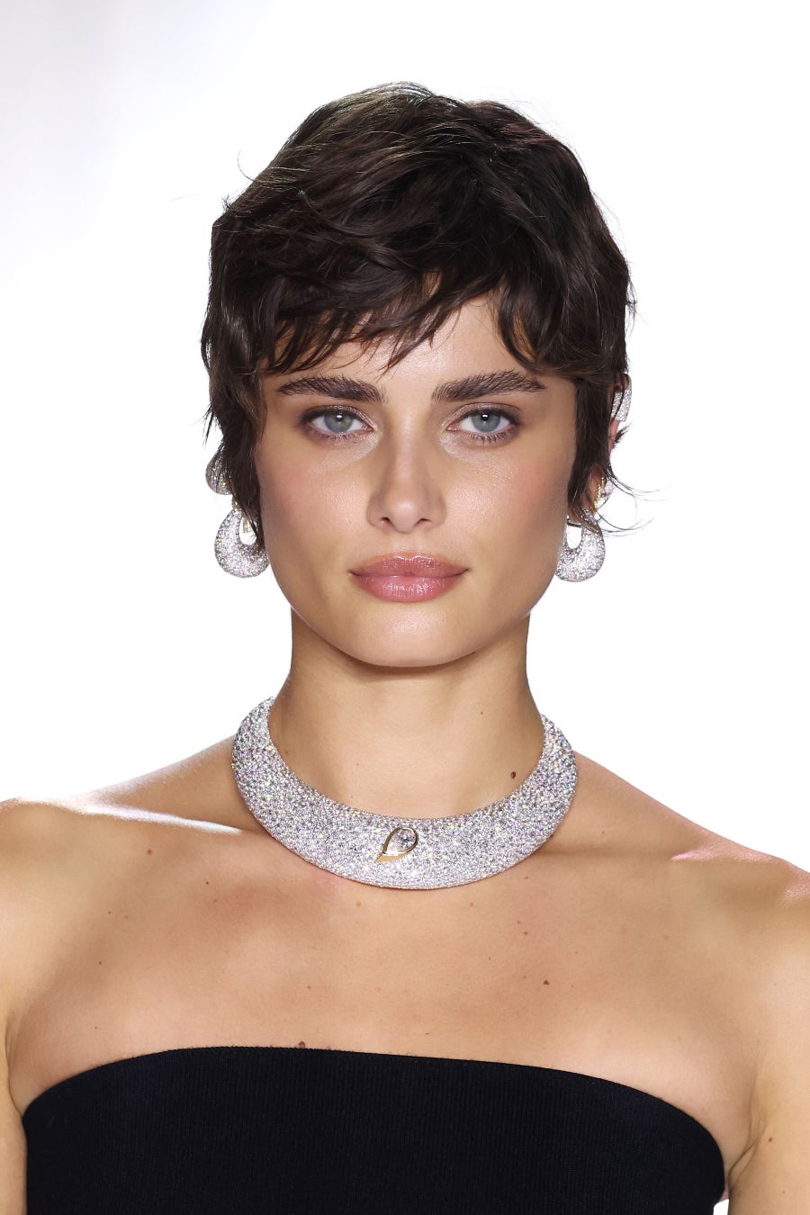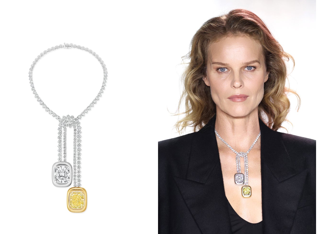 壮大な「Fragments of Time」は、アイコニックなエヴァ・ハーツィゴヴァ(Eva Herzigova)の首にかけられ、ショーを締めくくった。このダイヤモンド・ネックレスのために、ヴァレリー・メシカは36カラットの見事なイエロー・ダイヤモンドと33カラットの唯一無二なホワイト・ダイヤモンドをあえて組み合わせた。官能的なダイヤモンド・セッティングの中で、2つの永遠のかけらが複雑に絡み合ったネックレスだけで232石、合計129カラットとなった。