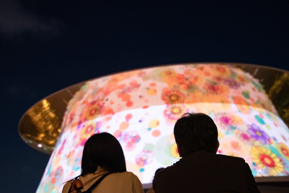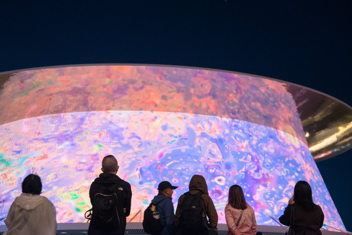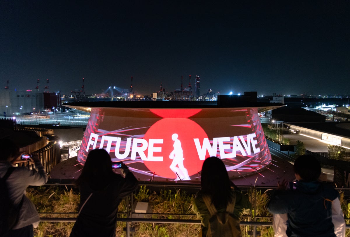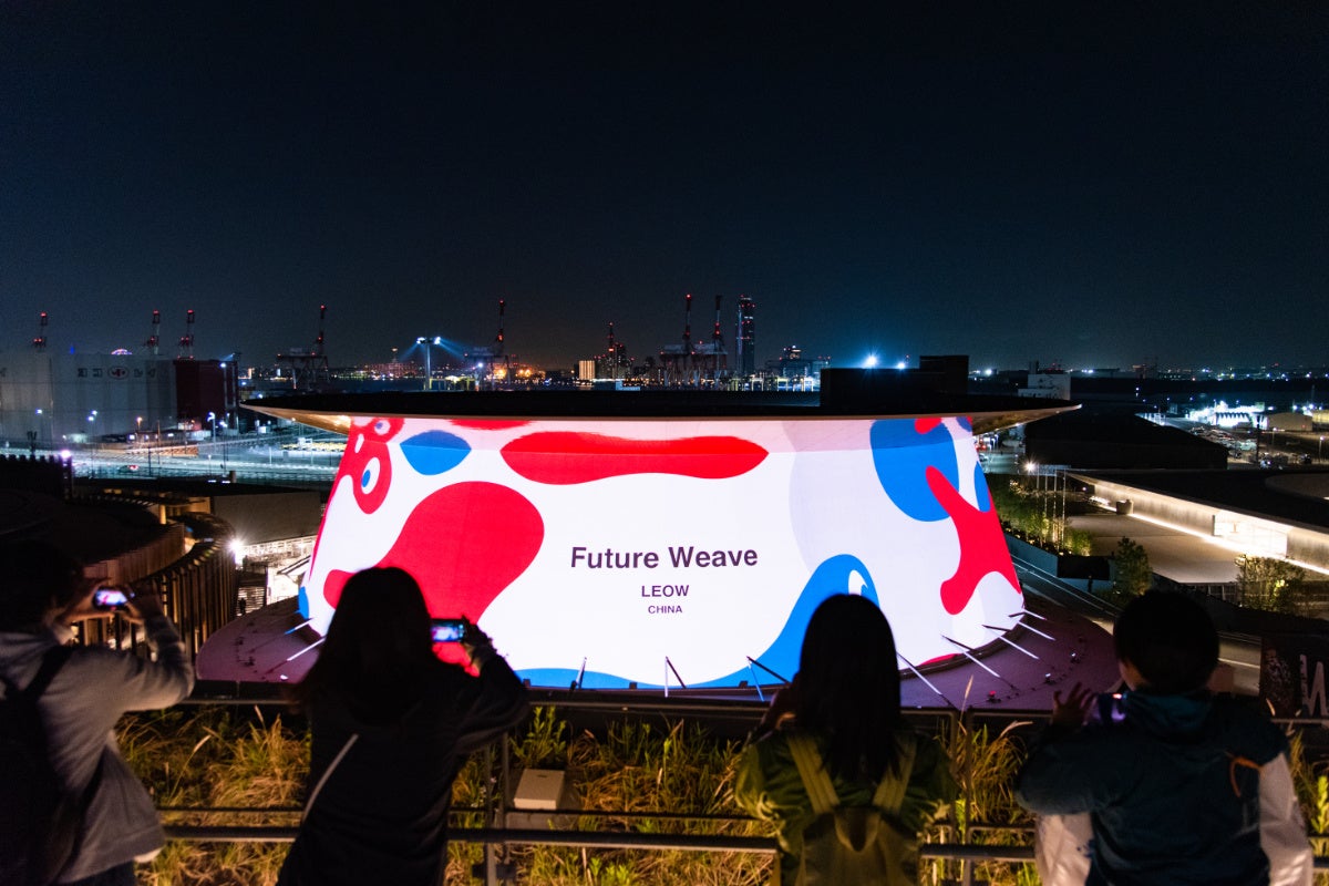 アーティストLEOWが率いる没入型プロジェクション作品《Future Weave》は、メインパビリオン「シャインハット」の外壁にてオープンからの1ヶ月間、毎晩2回上映され、5月12日まで続きます。