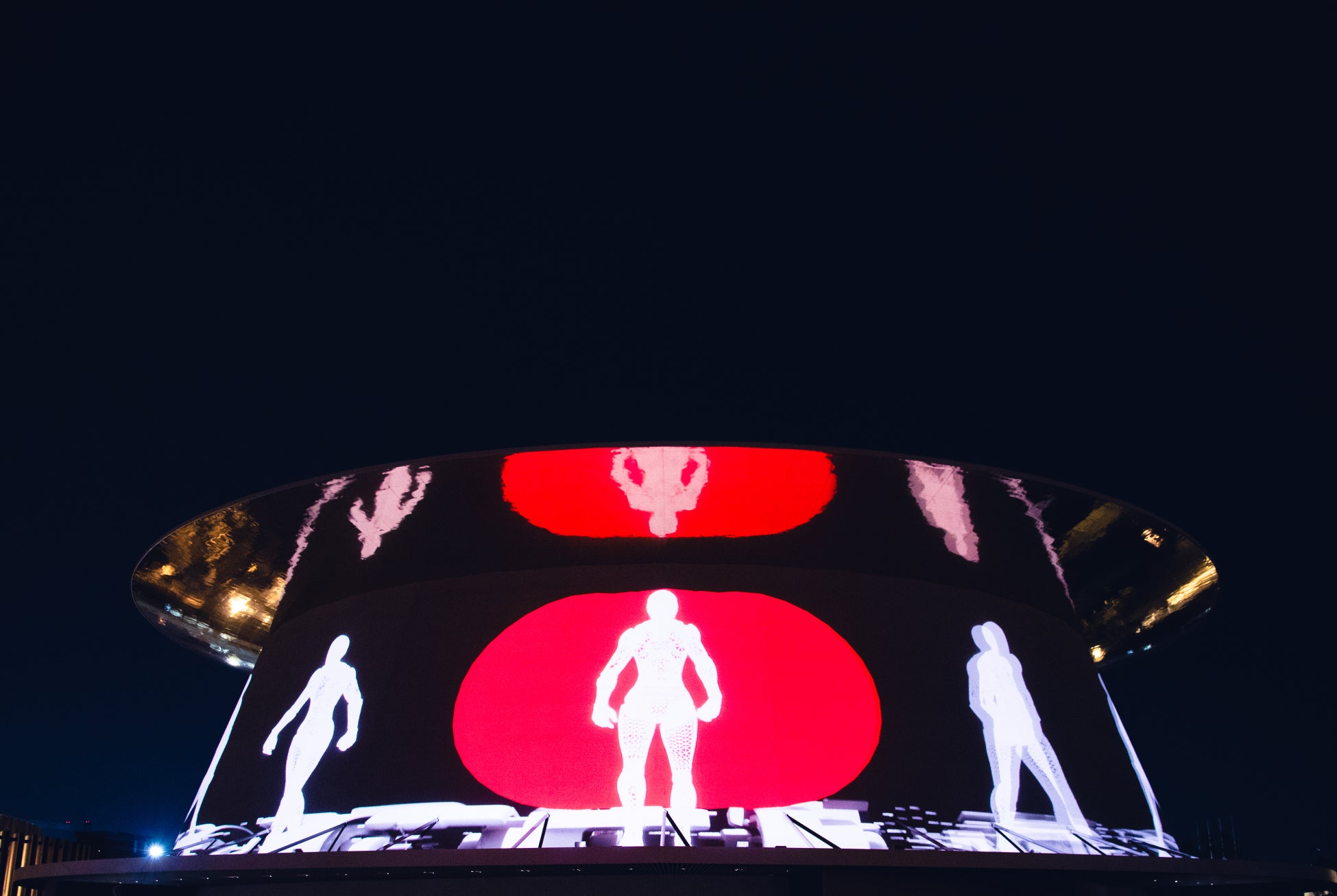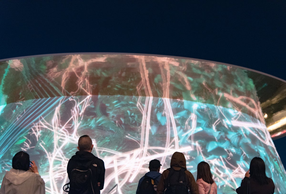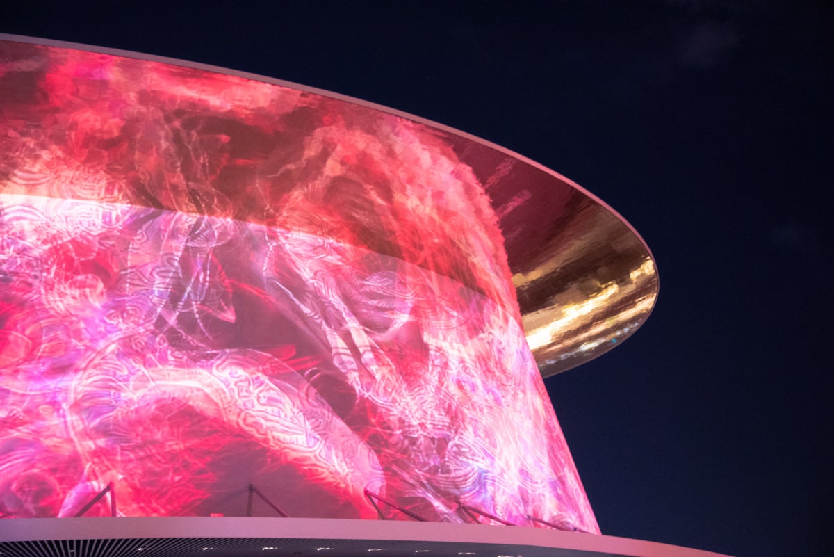 アーティストLEOWが率いる没入型プロジェクション作品《Future Weave》は、メインパビリオン「シャインハット」の外壁にてオープンからの1ヶ月間、毎晩2回上映され、5月12日まで続きます。