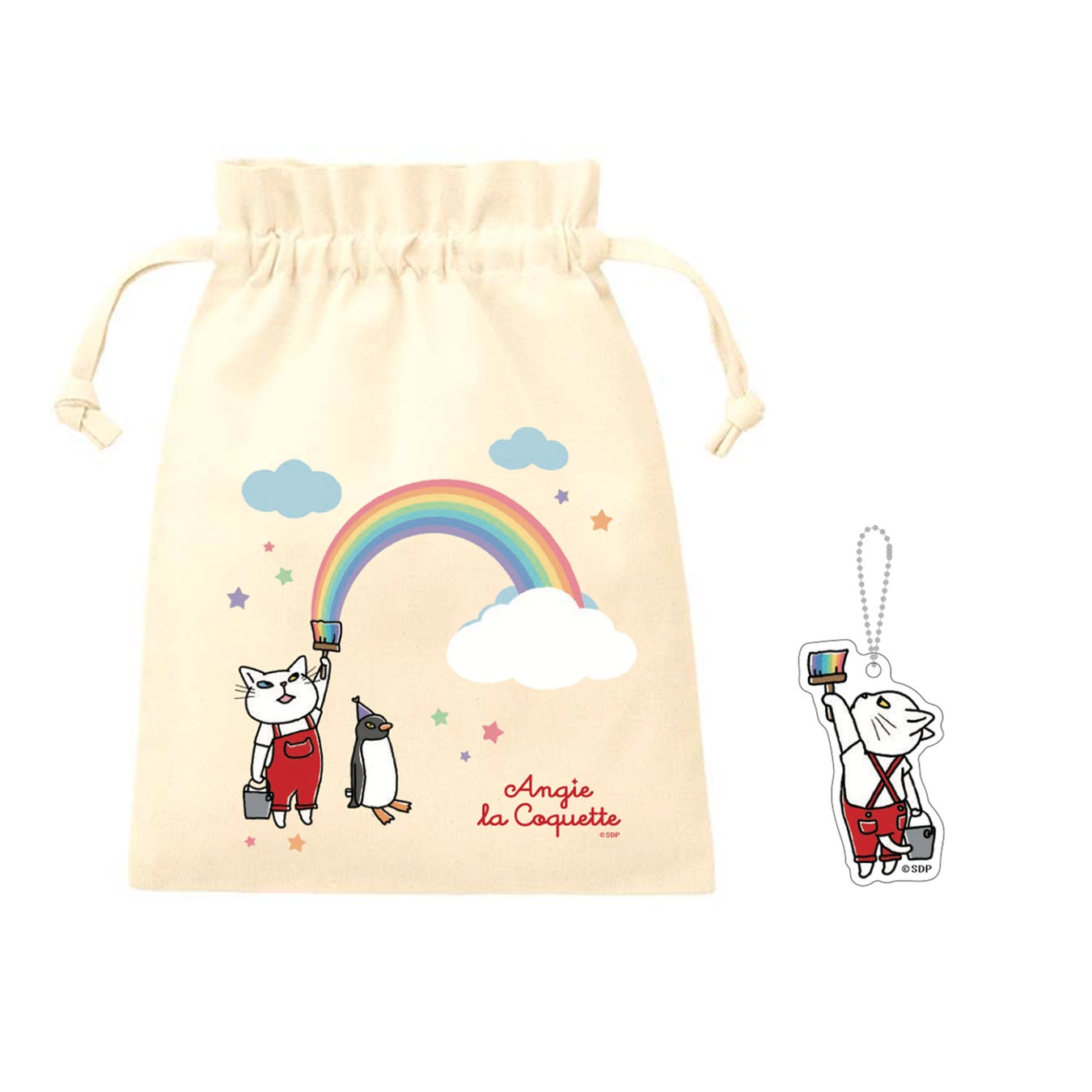虹を描くアンジーのアクリルチャームがついた大きいサイズの巾着です。