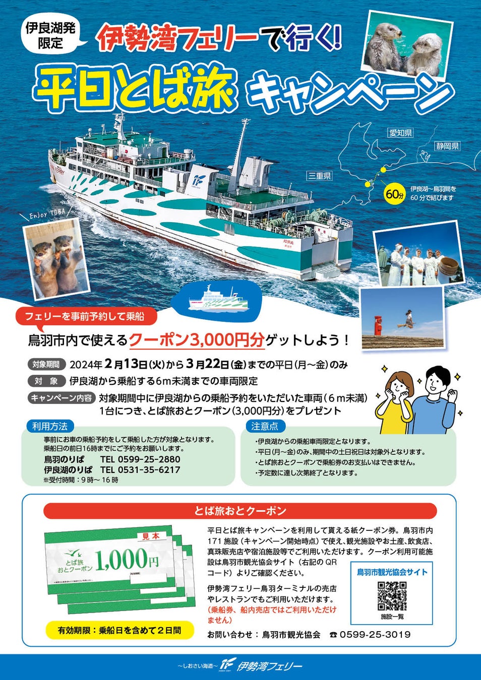 鳥羽市の平日の旅行需要の喚起、地域の活性化を図るため、一般社団法人鳥羽市観光協会とコラボし平日限定で観光キャンペーンを実施します。