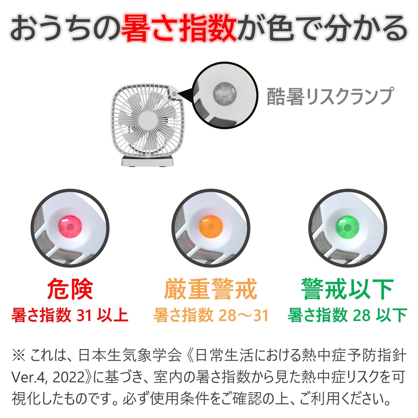 兼備生活の扇風機は、室内の気温と湿度を基に「暑さ指数」を算出し、暑さの危険性を酷暑リスクランプの色(緑、黄、赤)でお知らせします。