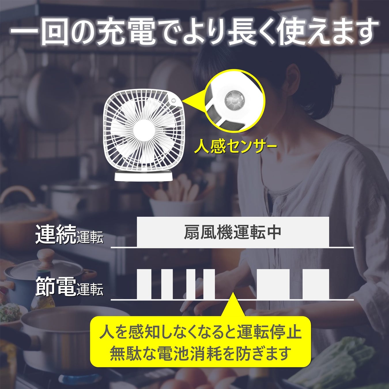 無駄な電池消耗を防ぐため、人感センサーを搭載。風が当たる範囲に人がいる時だけ扇風機が運転し、一回の充電でより長く使用することができます。