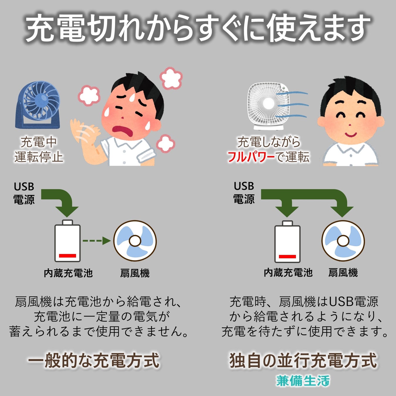 私たち兼備生活は、「日常も非常時も役立つ」というフェーズフリーのコンセプトを取り入れ、「日常を便利に、非常時に強い」ライフスタイルをサポートする専業メーカーとして、フェーズフリーな生活用品の開発に取り組んできました。2023年に発売した多用途デスクライトに続き、今回の扇風機をもって本年度はフェーズフリー家電のラインアップをさらに拡充していきます。今後とも兼備生活への応援とご愛顧を賜りますようお願い申し上げます。