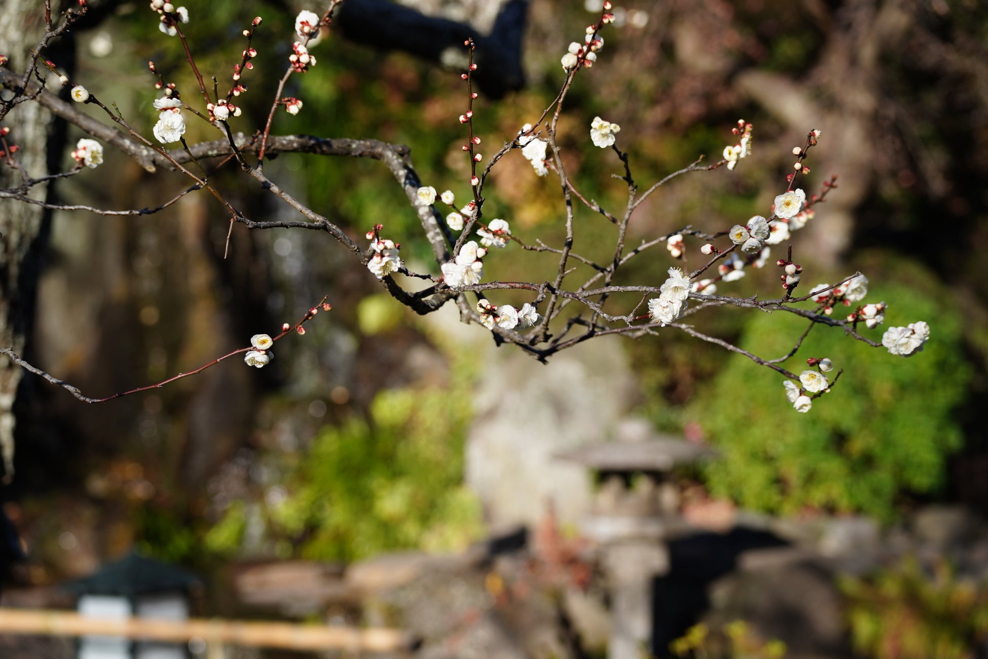 境内には8種類の梅の木が植えられており、早咲きから遅咲きへと長い期間に渡り、麗しい梅の花の彩りと香りを間近にお楽しみいただけます。