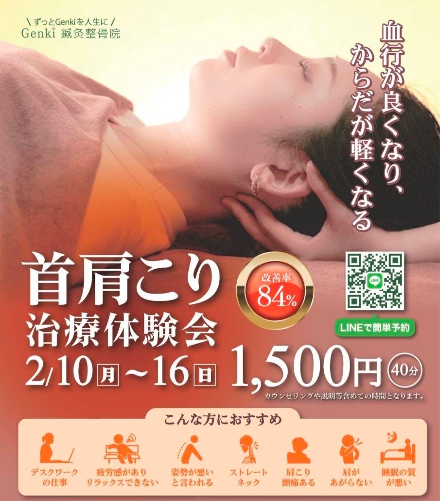 株式会社GENKI(本社:京都市、代表:吉村 直心)は、「首肩こり施術体験会」を2025年2月10日(月)から2月16日(日)まで開催します。首や肩のこりに悩む方々を対象に、猫背改善と血行促進により、肩こりの根本的な原因にアプローチする専門施術を体験いただけます。カウンセリングと施術で、40分間の特別体験を1,500円(税込)で受けることができます。