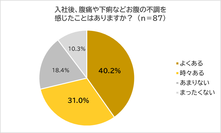 今度は、「入社後、腹痛や下痢などお腹の不調を感じたことはあるか?」尋ねました。こちらも「よくある」(40.2%)が最も多く、「時々ある」(31.0%)、「あまりない」(18.4%)、「まったくない」(10.3%)となりました。これにより、7割超(71.2%)の新社会人がお腹の不調を実感していることがわかりました。