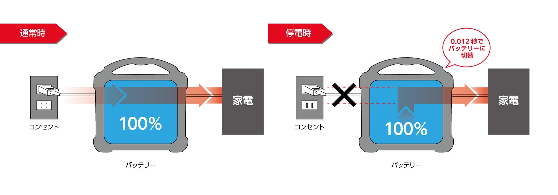 もしパススルー充電をしているときに停電やブレーカーが落ちて家電への給電が停止した場合0.012秒以内でポータブル電源の内蔵バッテリーに切り替わり、電化製品をそのまま使い続けることができます。