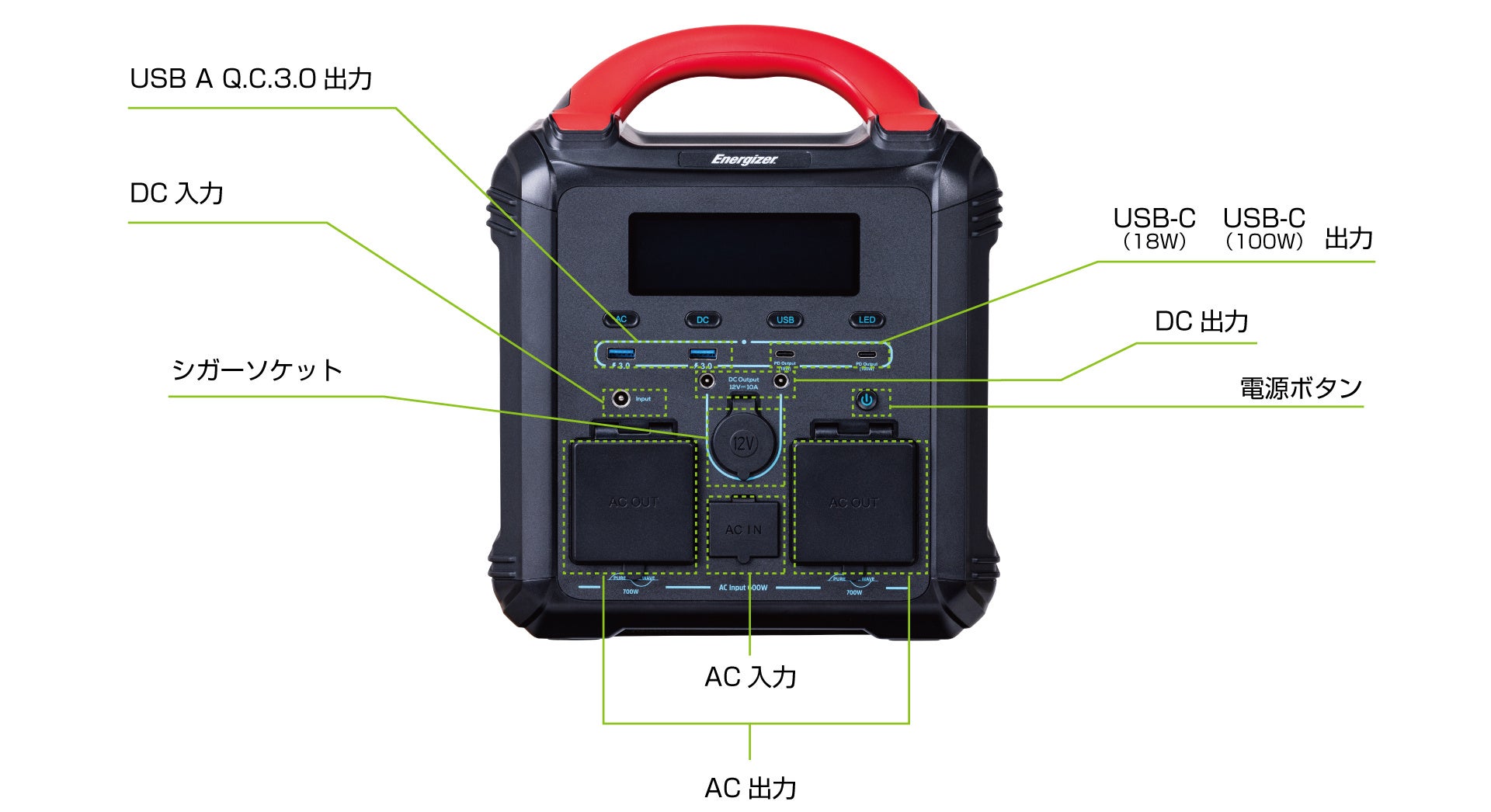屋外でも家電が使える、瞬間最大1,400W出力・定格出力合計700Wの高出力