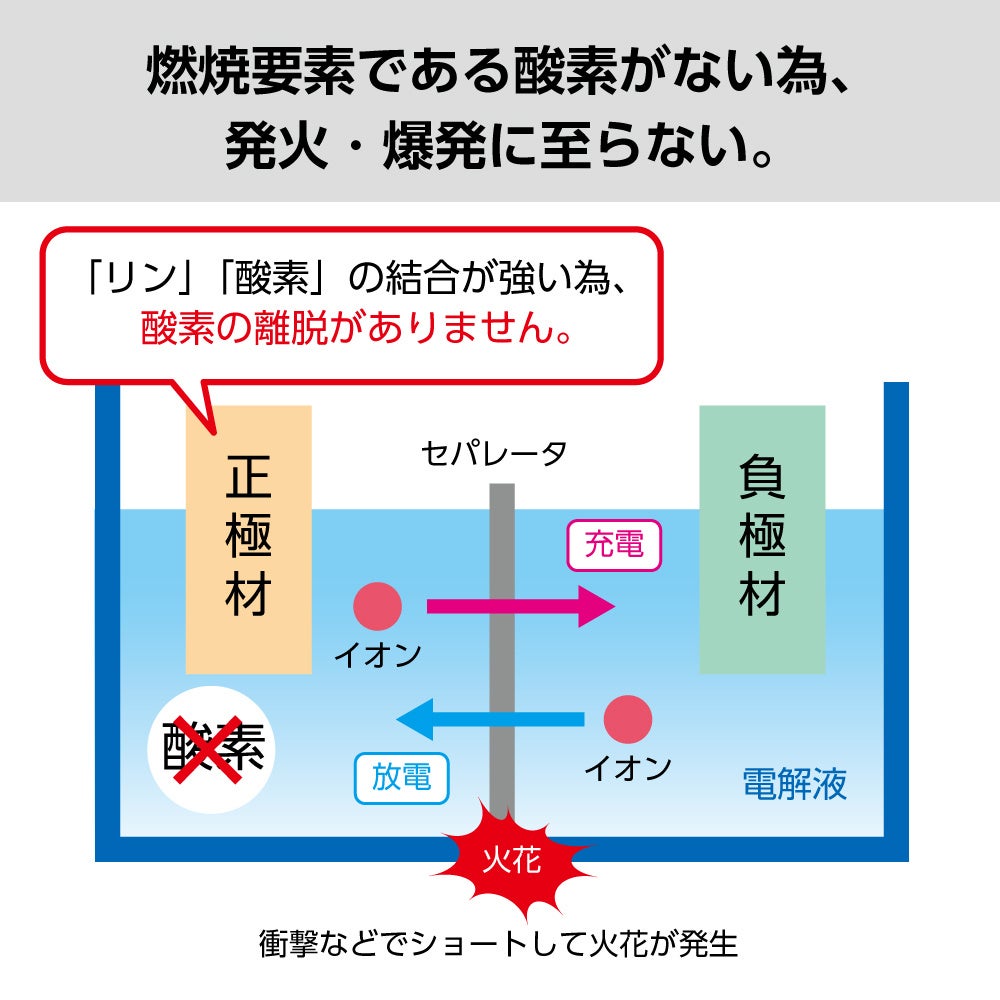 正極材(+極)の「リン(P)」と「酸素(O)」の 分子間の結合が強い為、酸素の離脱がありません。 何らかの原因で、高温になったり衝撃などでショートが起こり、火花が発生しても燃焼要素である酸素が存在しない為に、発火・爆発に至りにくい安全な電池です。